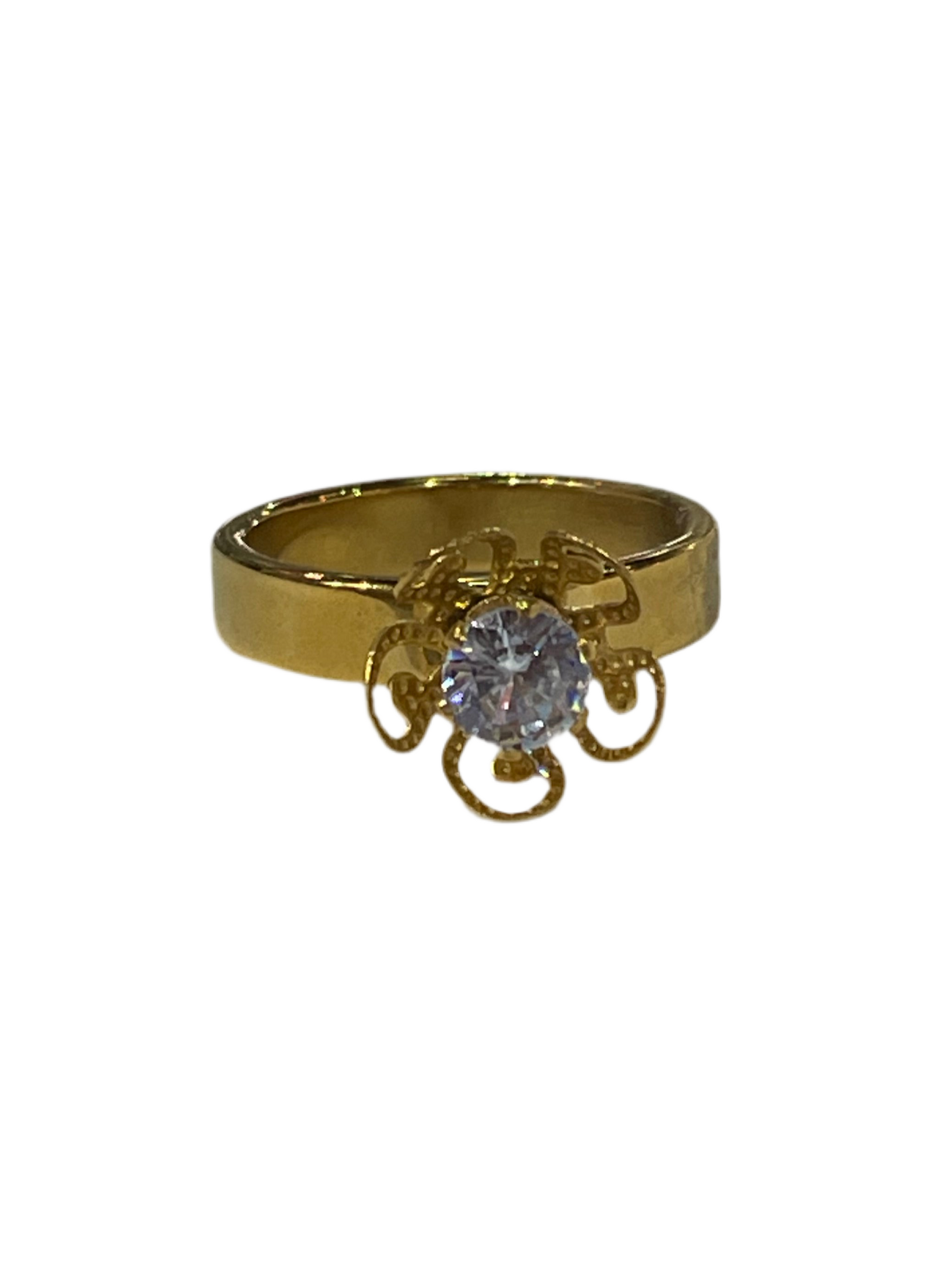 Celebra la delicadeza y el estilo con este encantador anillo con diseño de flor. Disponible en acabado plateado o dorado, su detalle central es una delicada flor en relieve, que en su corazón luce una brillante piedra de circonia blanca, agregando un toque sutil de brillo y elegancia.
