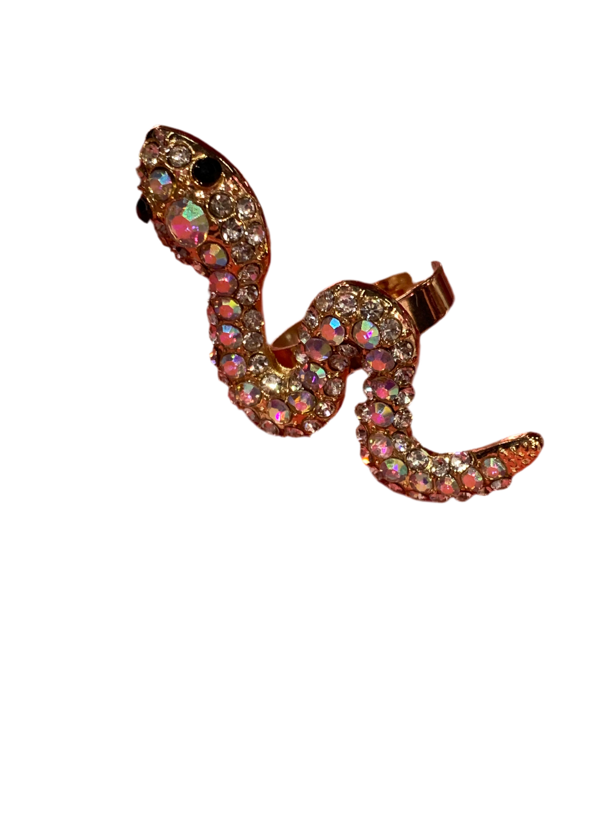 Haz una declaración audaz con este anillo de serpiente ajustable, una joya de fantasía que combina glamour, misterio y estilo. Su diseño enroscado simula el movimiento elegante de una serpiente, mientras que su cuerpo está decorado con piedrería brillante que captura la luz desde todos los ángulos.