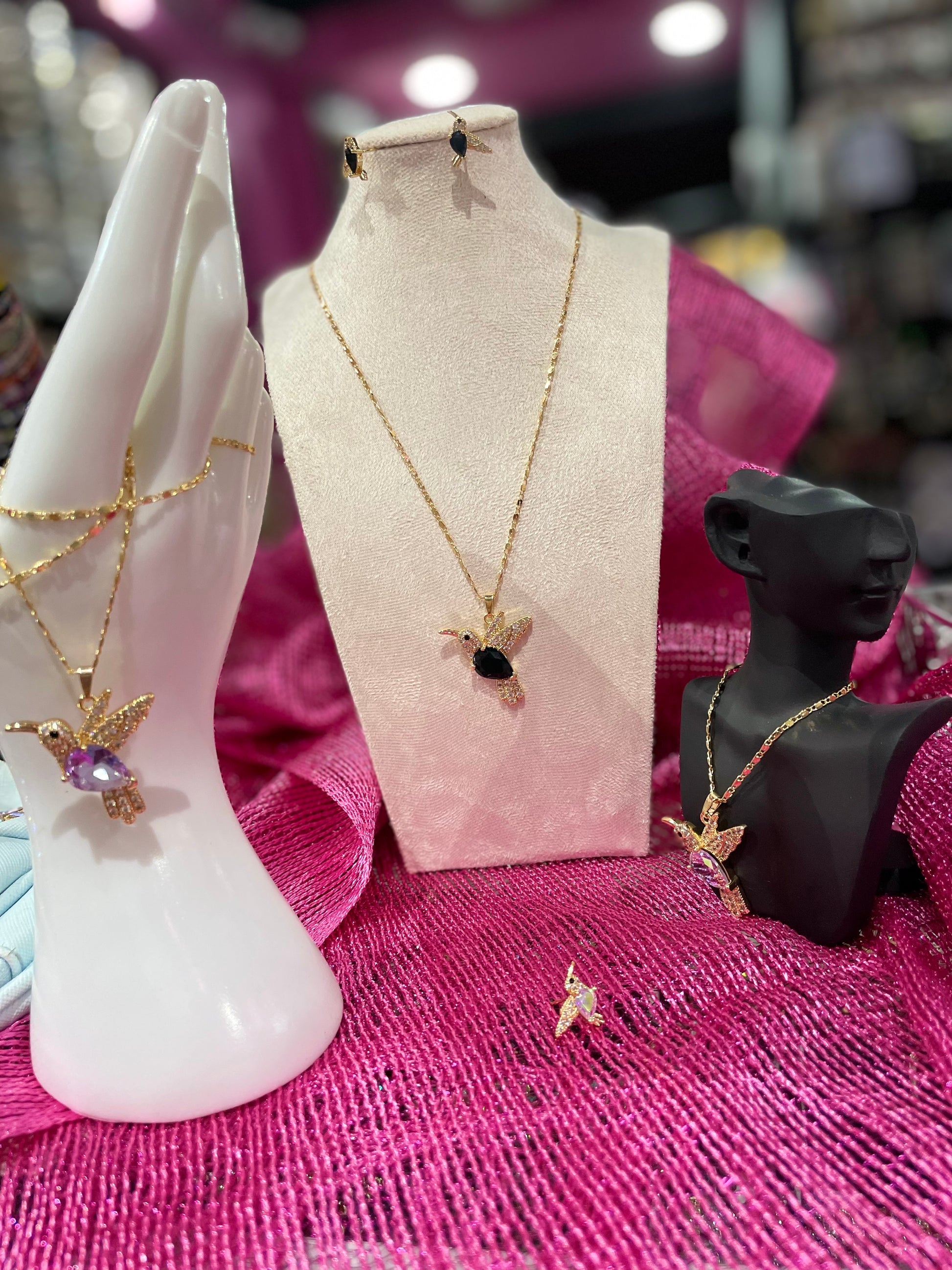 Collar con dije de colibrí dorado, diseñado con detalles finos y una piedra brillante en el centro que le da un toque elegante. Ideal para cualquier ocasión, este collar es perfecto para quienes buscan un accesorio único y llamativo. Su diseño moderno y brillante te hará destacar.