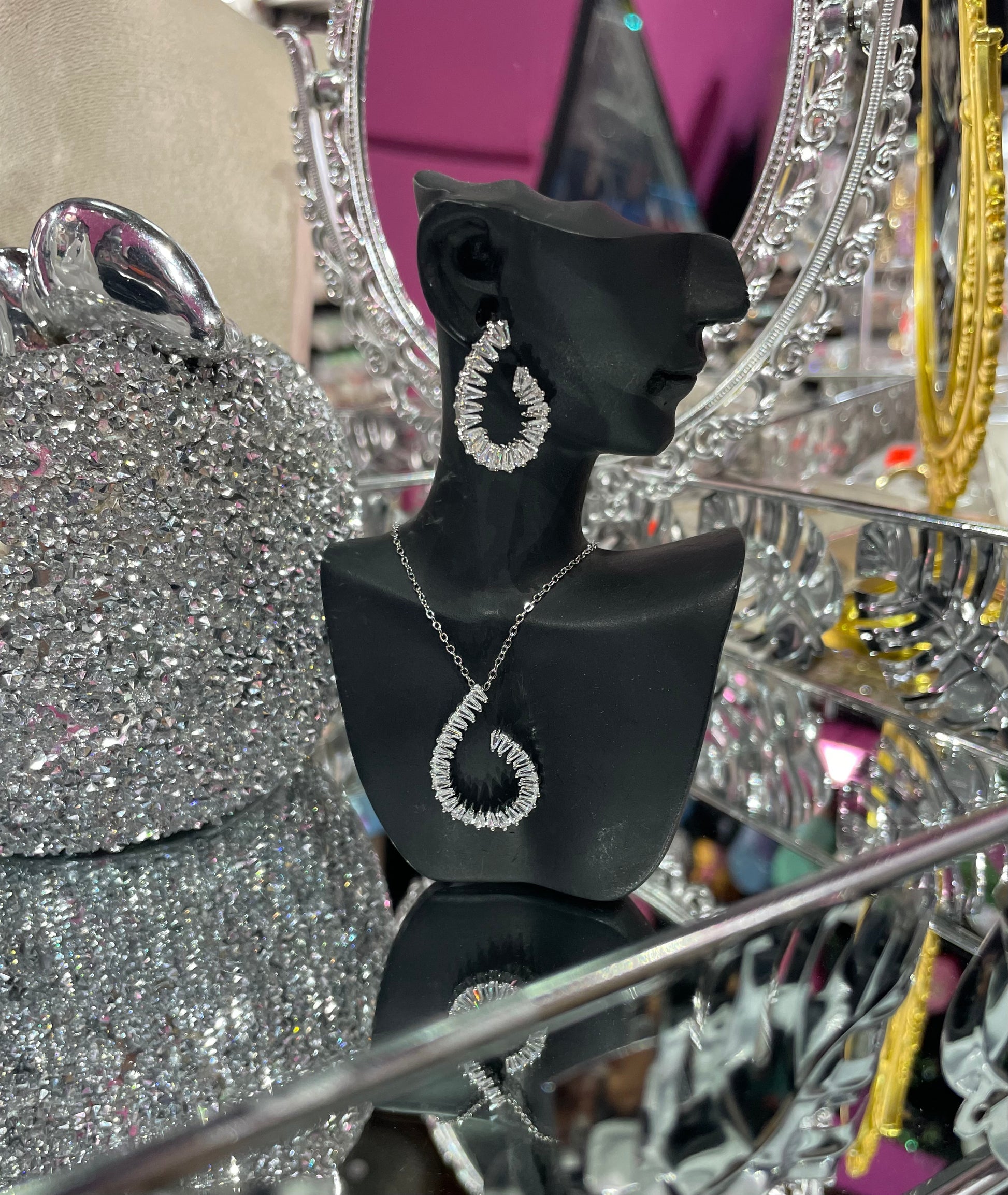 Luce elegante y sofisticada con este delicado conjunto de collar y aretes de zirconia. El collar presenta una fina cadena acompañada de un dije con diseño en forma de espiral brillante, que captura la luz con cada movimiento. Los aretes a juego completan el look con un toque sutil y glamuroso.