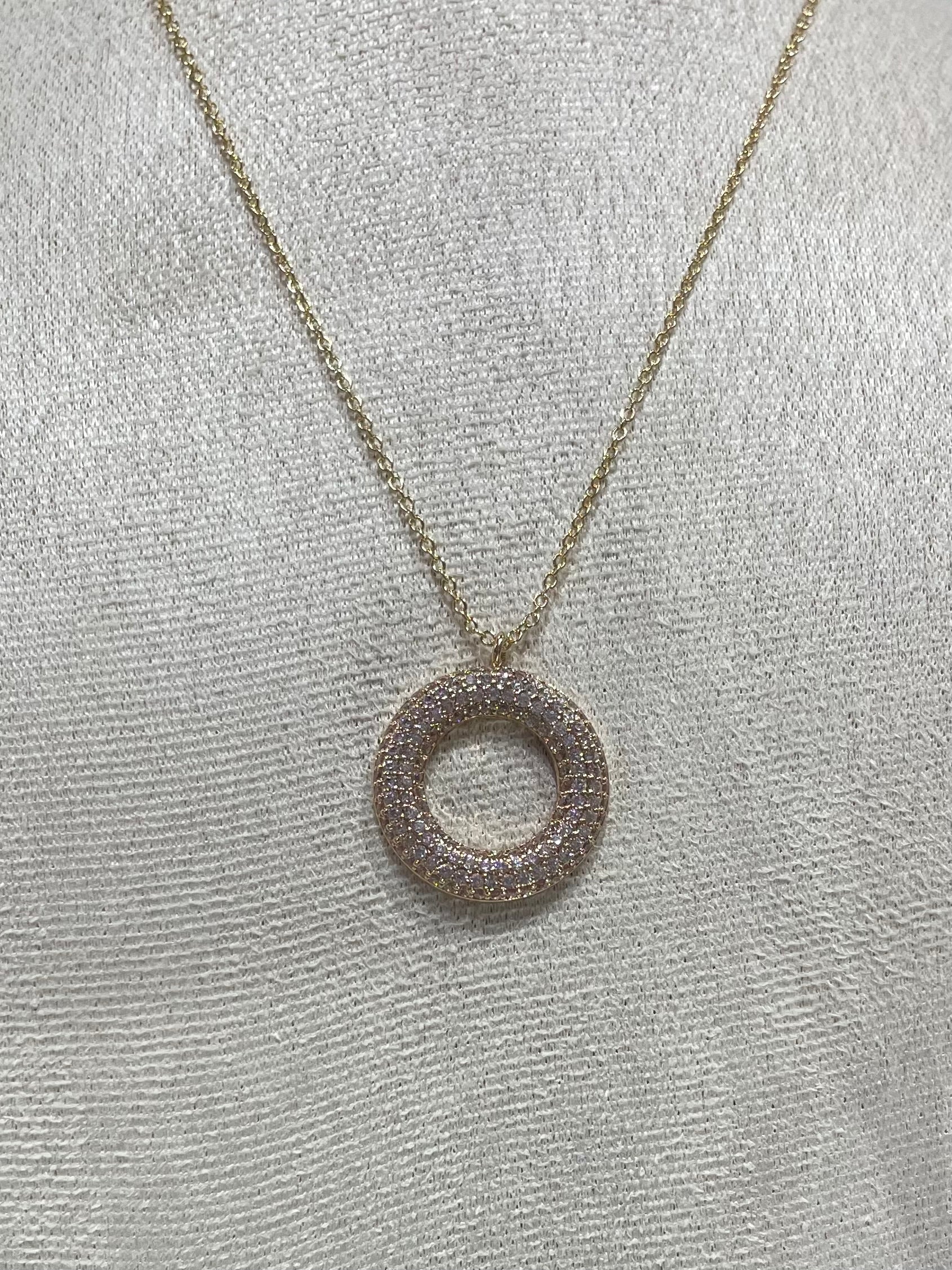 El dije tiene forma de dona, cuidadosamente decorado con zirconias cúbicas brillantes que capturan la luz desde cualquier ángulo, añadiendo un destello sutil pero llamativo a tu atuendo. Está disponible en dos acabados clásicos: dorado cálido para un look más glamoroso y plateado brillante para un estilo moderno y versátil.