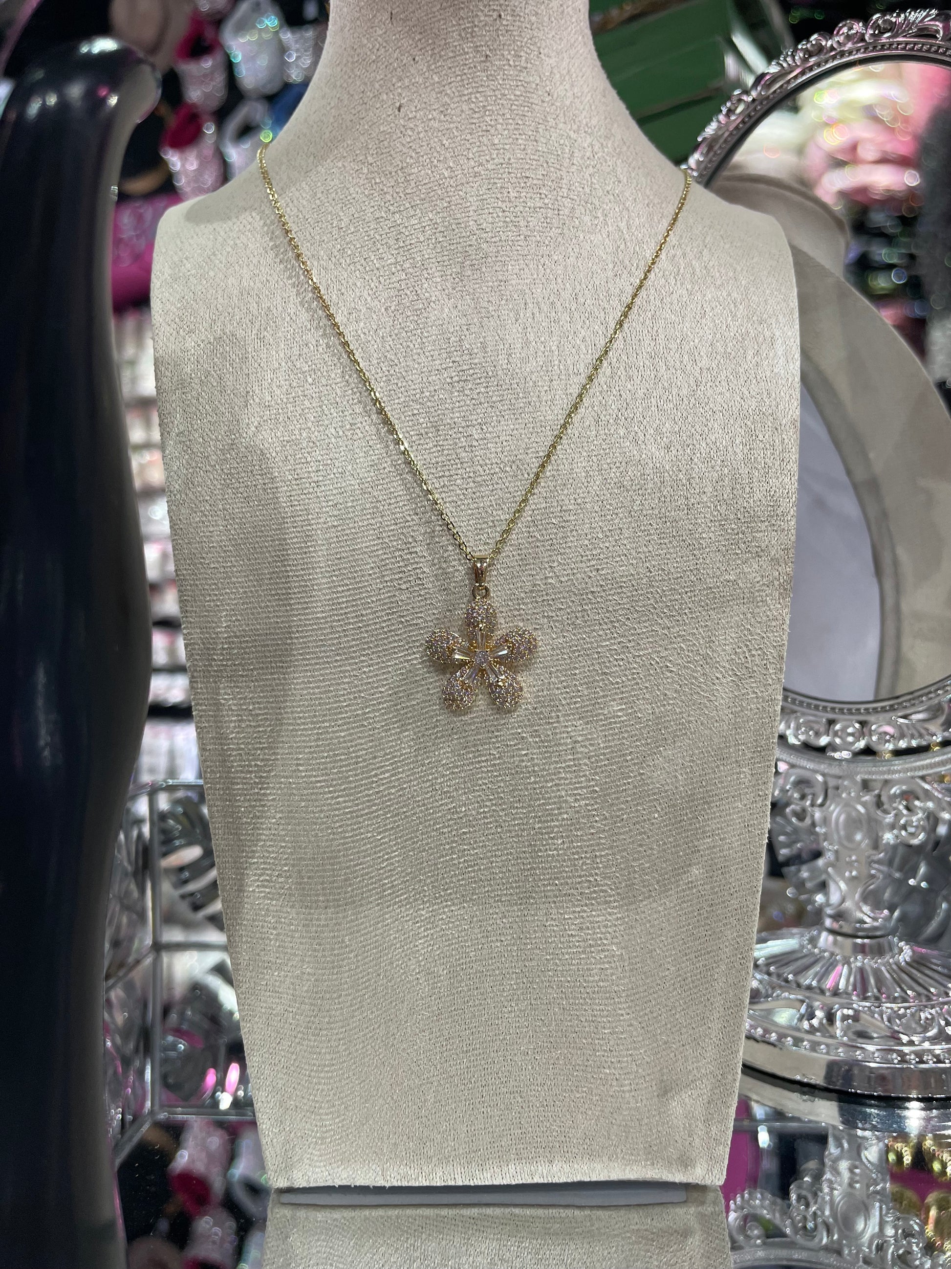 Este exquisito collar en tono dorado es una pieza diseñada para destacar con sutileza y sofisticación. Su delicado dije en forma de flor evoca la belleza y armonía de la naturaleza, mientras que las brillantes zirconias incrustadas aportan un destello que captura la luz desde cada ángulo.