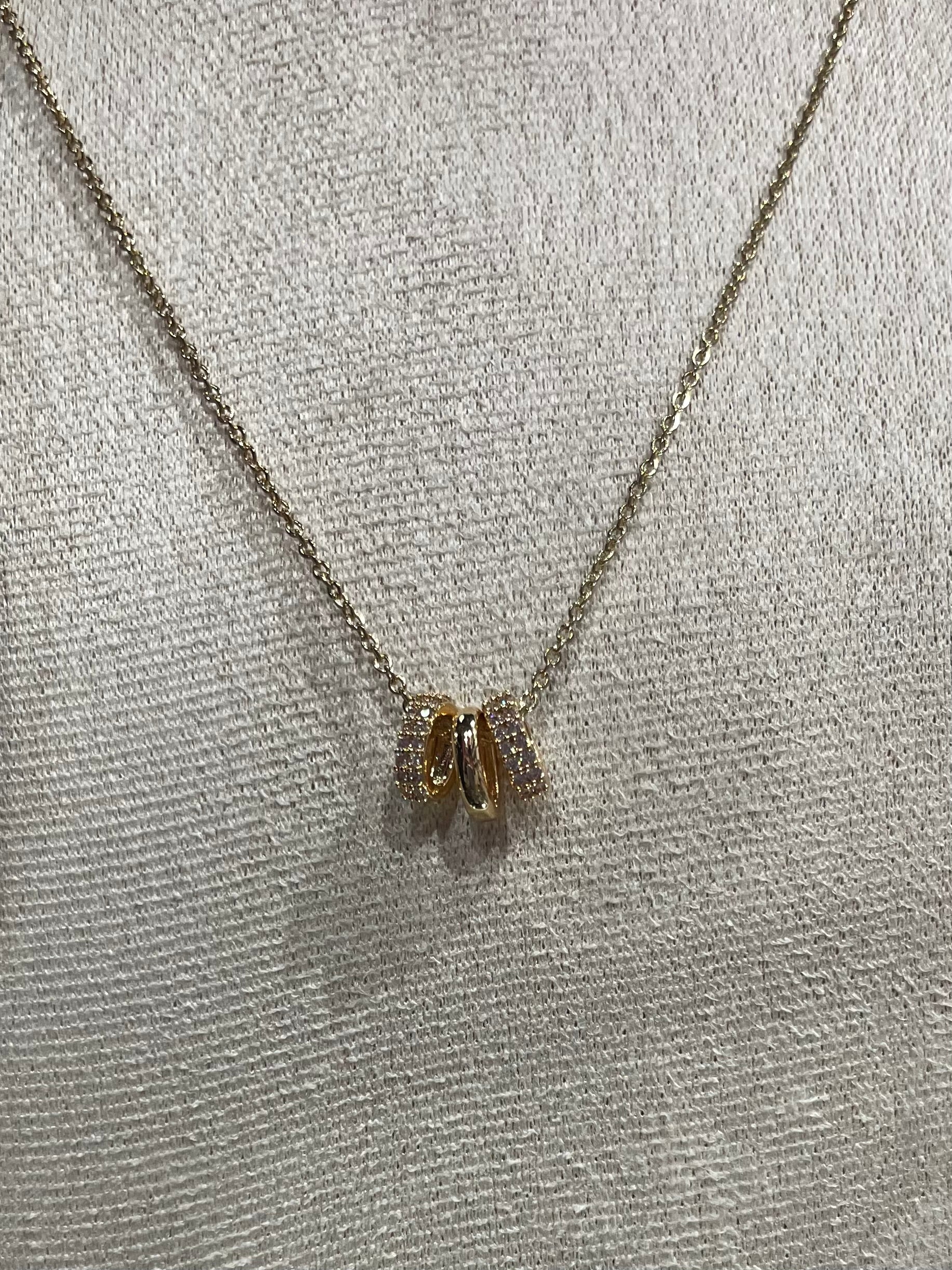 El collar está adornado con tres dijes pequeños en forma circular, también en color dorado, que cuelgan de manera delicada y armoniosa. Cada dije representa sutileza y equilibrio, aportando un detalle encantador sin sobrecargar tu look.