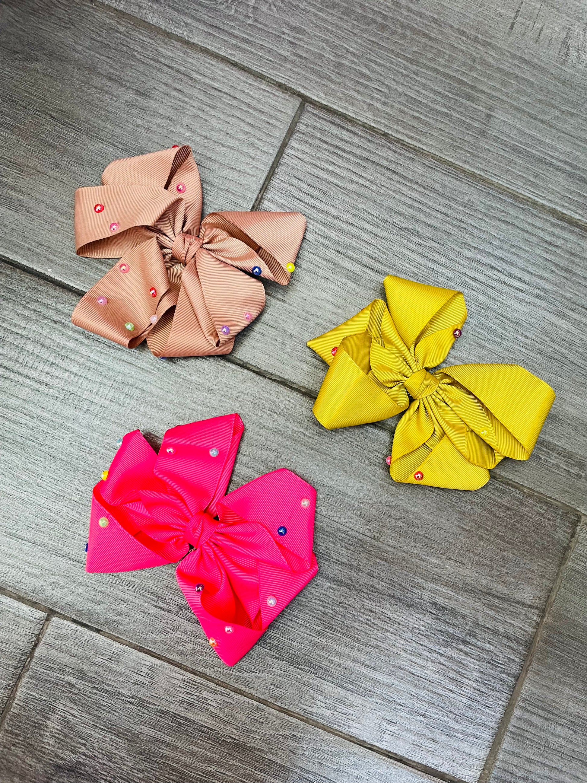 El moño con perlas de colores es un accesorio sofisticado y divertido que combina la elegancia de las perlas con un toque moderno y vibrante. Hecho de tela suave, como el satén o el algodón, el moño tiene una estructura bien definida con lazos amplios que aportan volumen y presencia. En su centro o a lo largo de los lazos, se encuentran delicadas perlas de colores, que van desde tonos suaves como el rosa, el blanco y el lila, hasta colores más vibrantes como el azul, el verde o el dorado. Estas perlas añaden un toque de luminosidad y un detalle de lujo, creando un contraste hermoso con la tela del moño. Ideal para ocasiones especiales, fiestas o incluso para darle un toque único y elegante a un look diario, el moño con perlas de colores es perfecto para quienes buscan un accesorio llamativo y lleno de estilo.