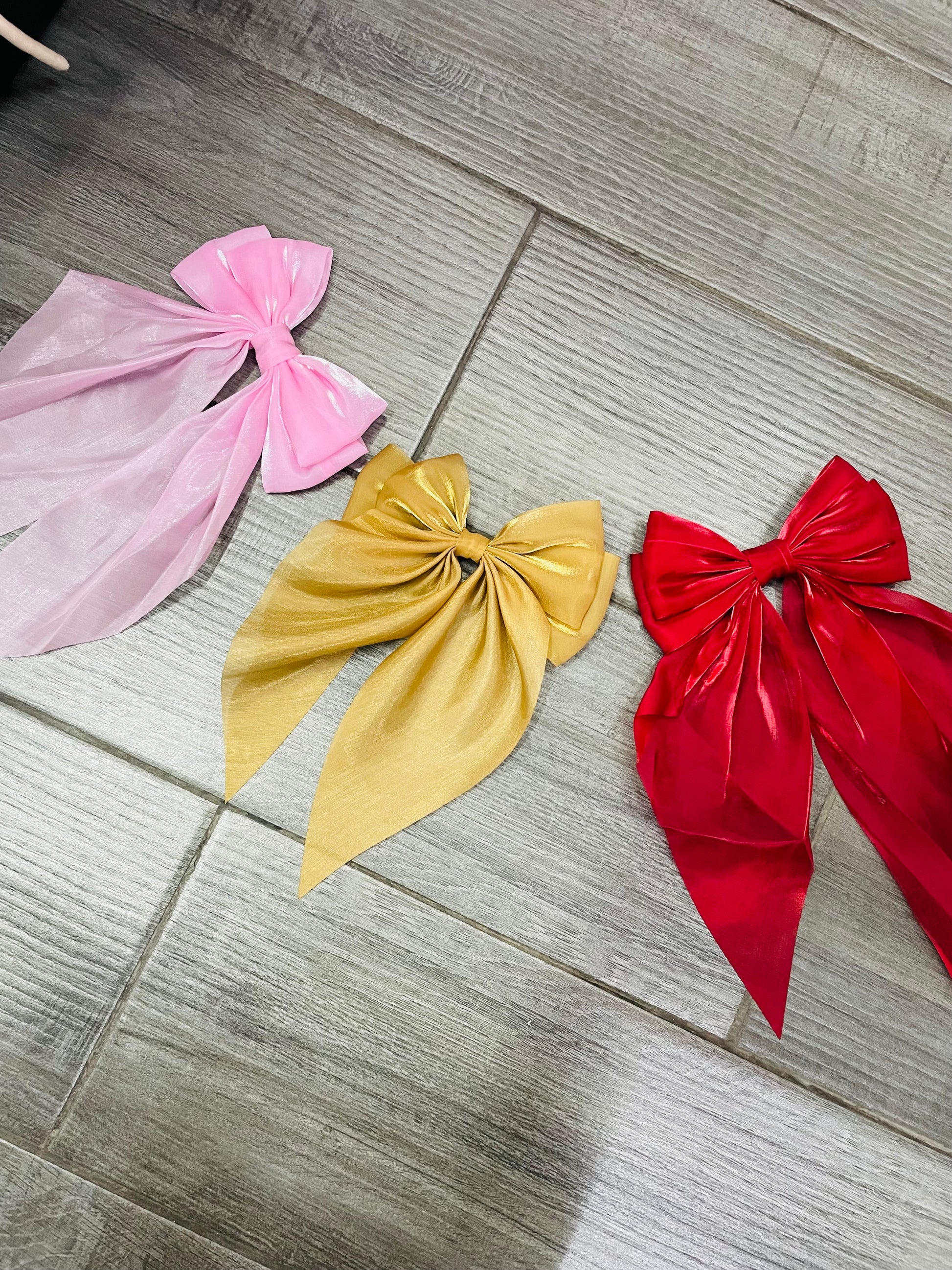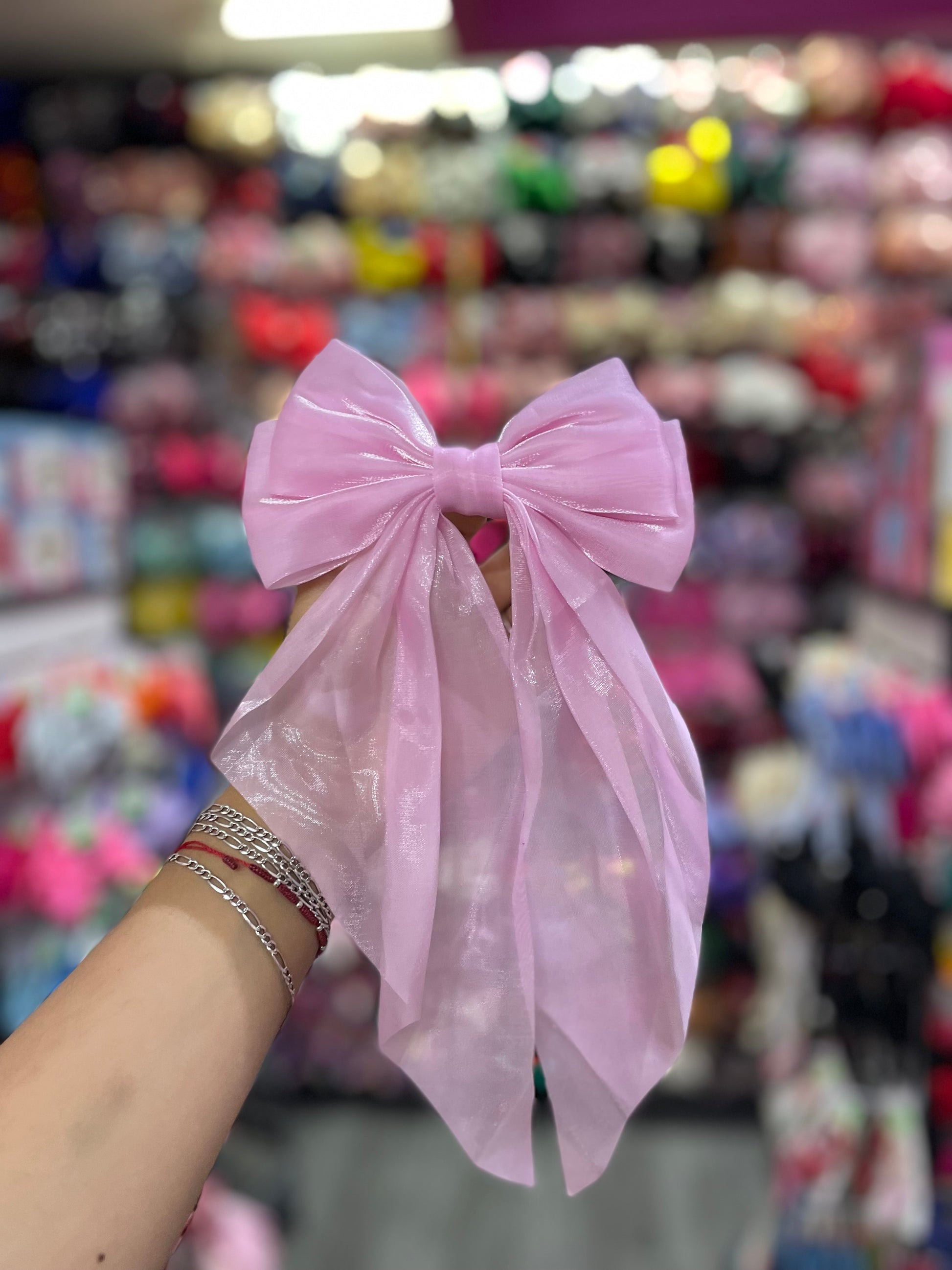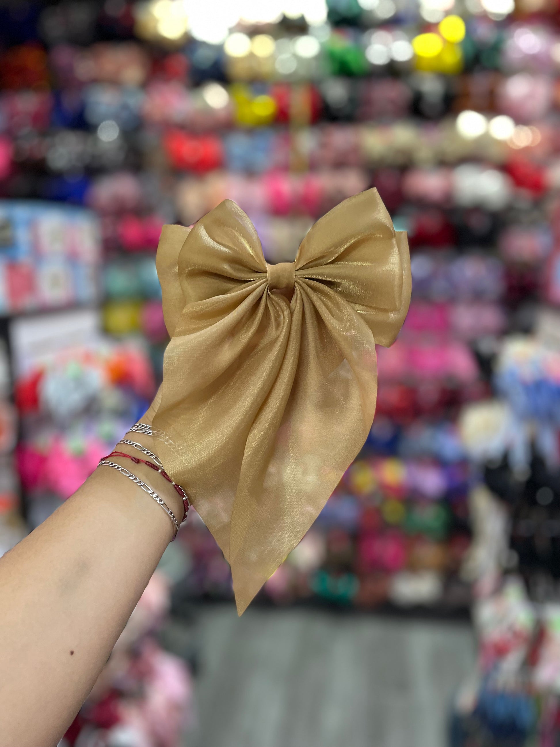 Un moño de organza con brillo es un accesorio delicado y sofisticado que combina la transparencia y ligereza de la organza con un toque sutil de resplandor. La organza, una tela fina y ligeramente rígida, le da al moño una estructura aireada y fluida, mientras que el brillo, ya sea en forma de partículas iridiscentes o un acabado perlado, cubre la tela de manera delicada, captando la luz y añadiendo un toque luminoso. Este moño es perfecto para ocasiones especiales como bodas, fiestas o eventos elegantes, aportando un toque de glamour sin ser demasiado recargado. Su diseño ligero y brillante hace que se convierta en un detalle encantador y sofisticado que complementa a la perfección un look refinado y festivo.