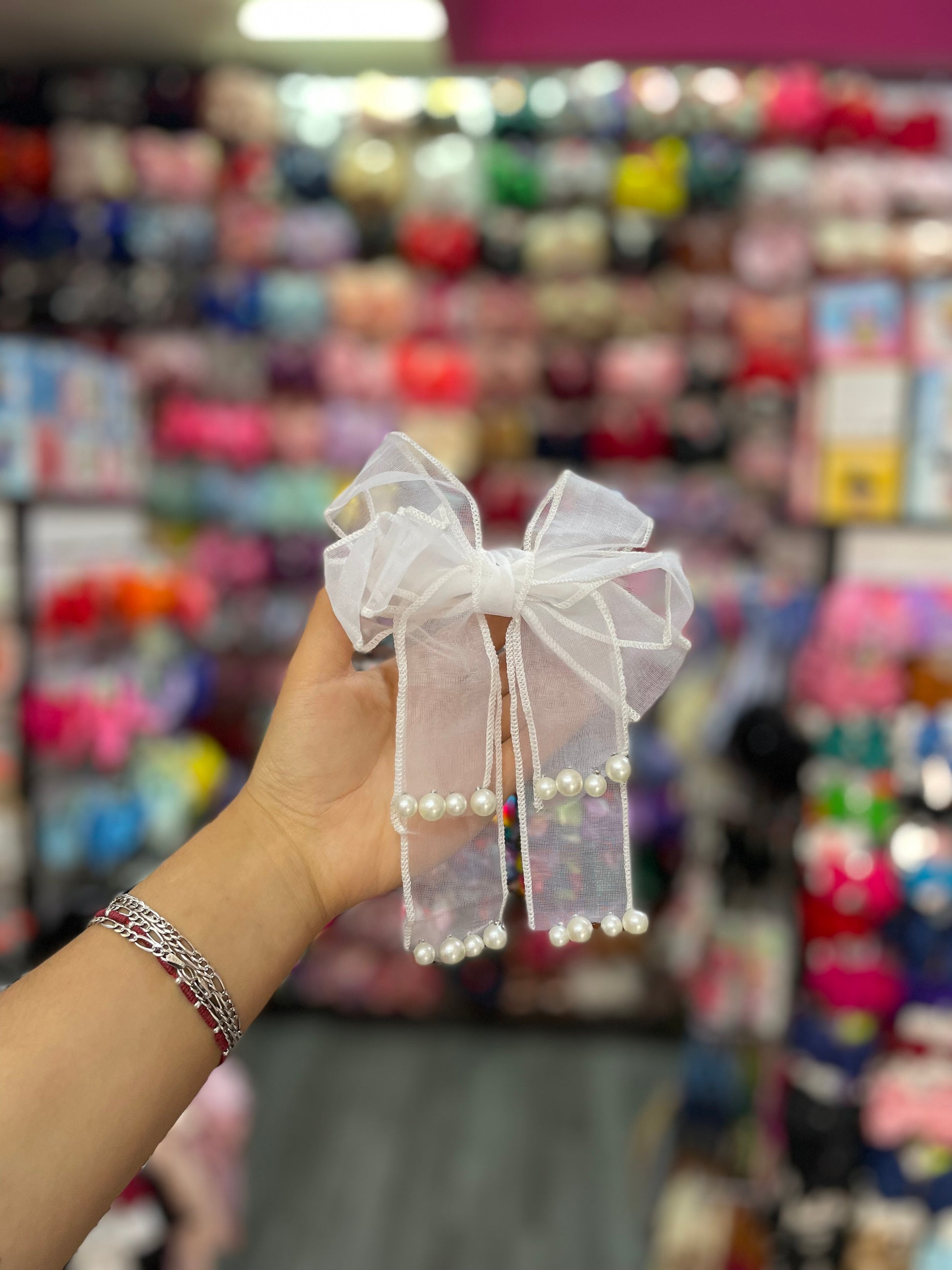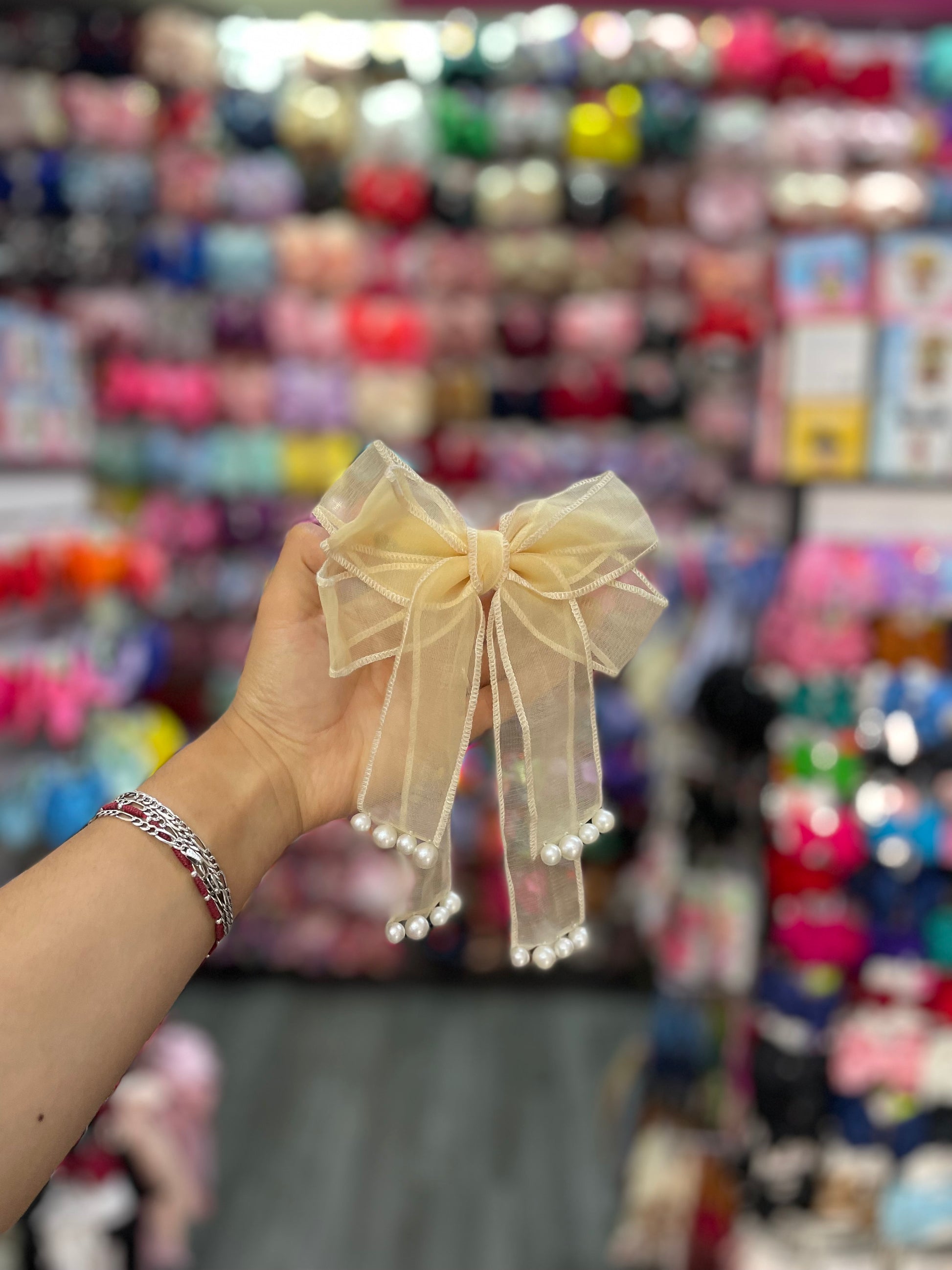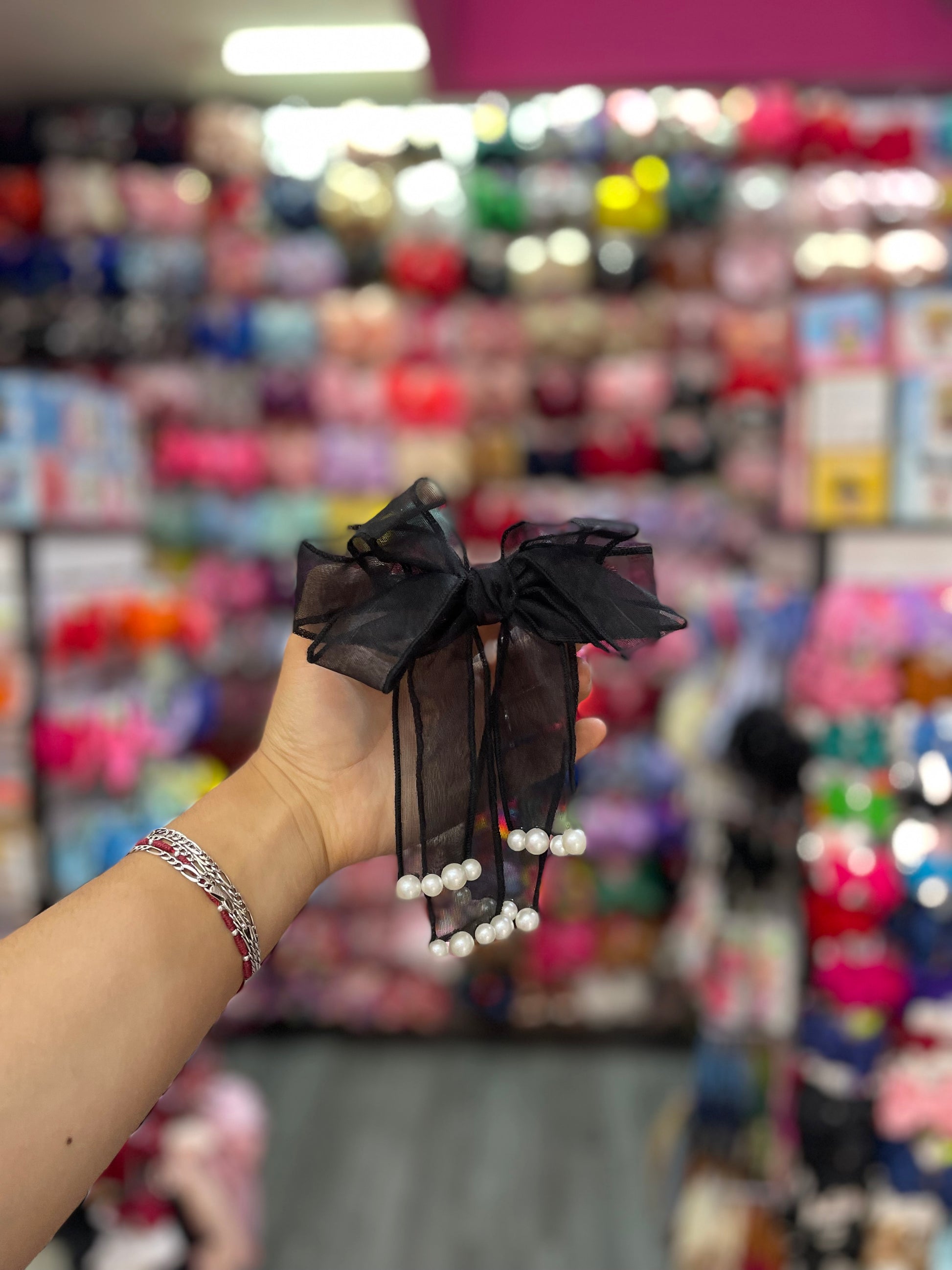 Un moño de tul con perlas en sus lazos es un accesorio delicado y elegante que combina la ligereza del tul con el toque sofisticado de las perlas. El moño está formado por varias capas de tul, creando un efecto suave y aireado que le da volumen sin ser demasiado pesado. Los lazos del moño están decorados con pequeñas perlas distribuidas de manera uniforme, aportando un detalle de lujo y feminidad. Las perlas, que pueden ser de tono blanco, marfil o incluso doradas, añaden un toque de brillo sutil pero elegante al diseño. Este moño es ideal para ocasiones especiales, como bodas, fiestas formales o eventos elegantes, y es perfecto para complementar peinados románticos o de gala.