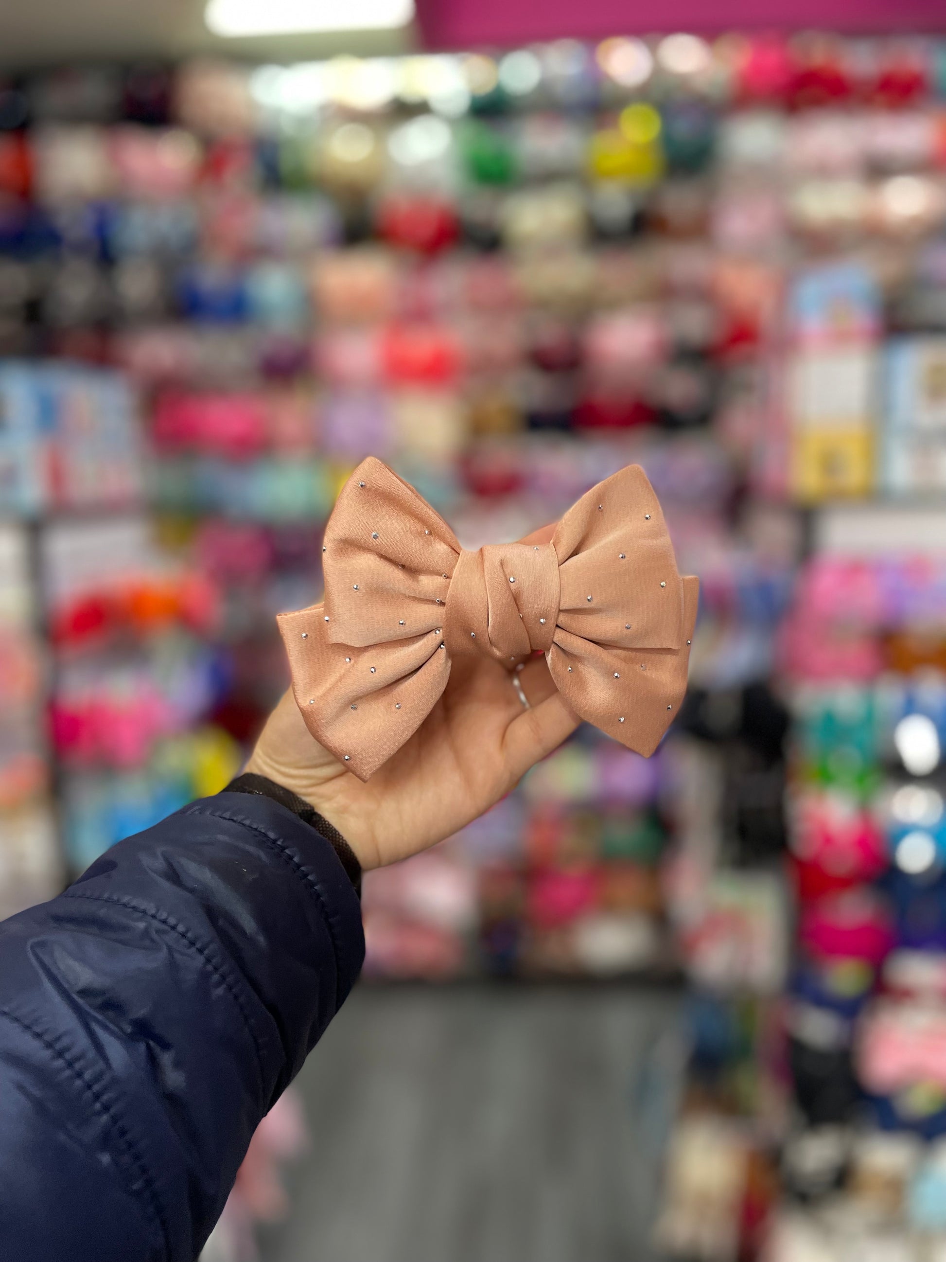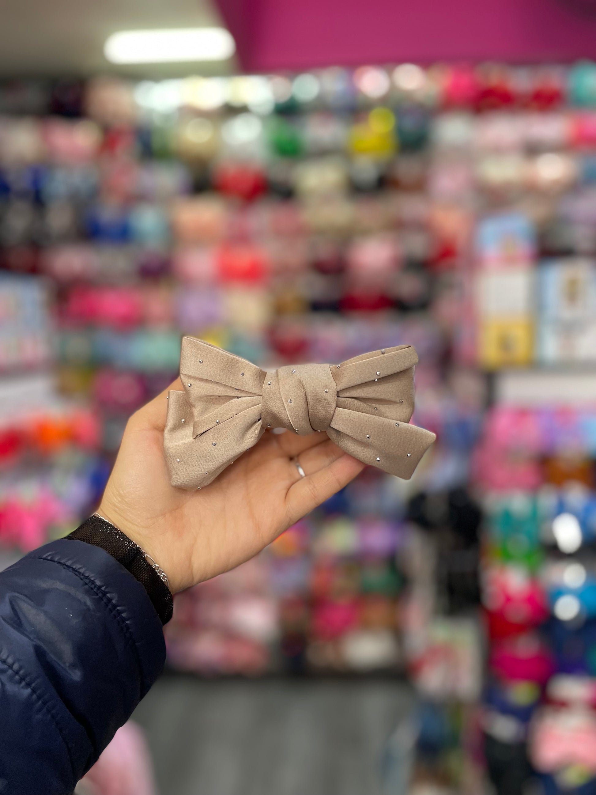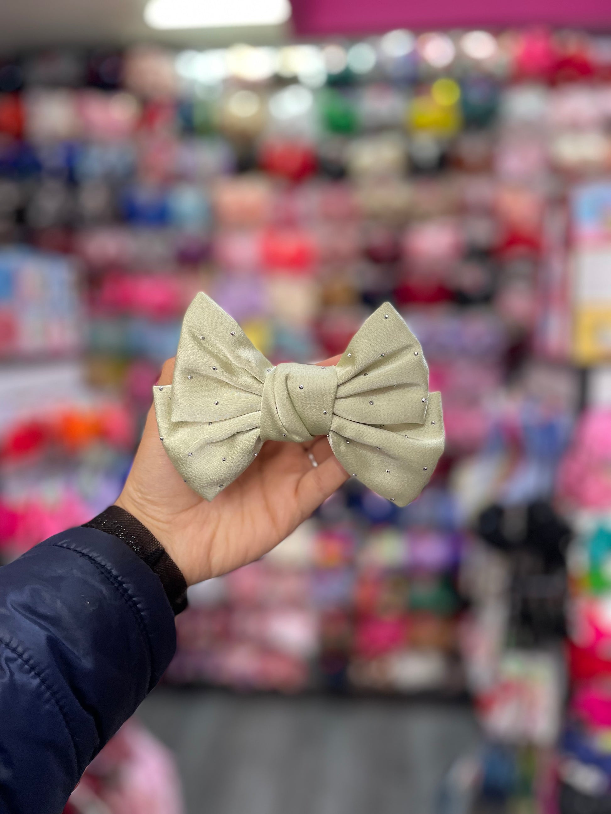 Este moño doble con pedrería es una pieza de lujo que combina elegancia y sofisticación. Formado por dos capas de tela que se entrelazan perfectamente, el moño presenta un diseño refinado y voluminoso, realzado con destellos de pedrería brillante. Las piedras, cuidadosamente distribuidas, aportan un toque de glamour y resplandor, ideal para ocasiones especiales como bodas, galas o eventos de noche. Su estructura firme y su acabado impecable hacen de este moño una opción perfecta para complementar peinados elegantes y con estilo.