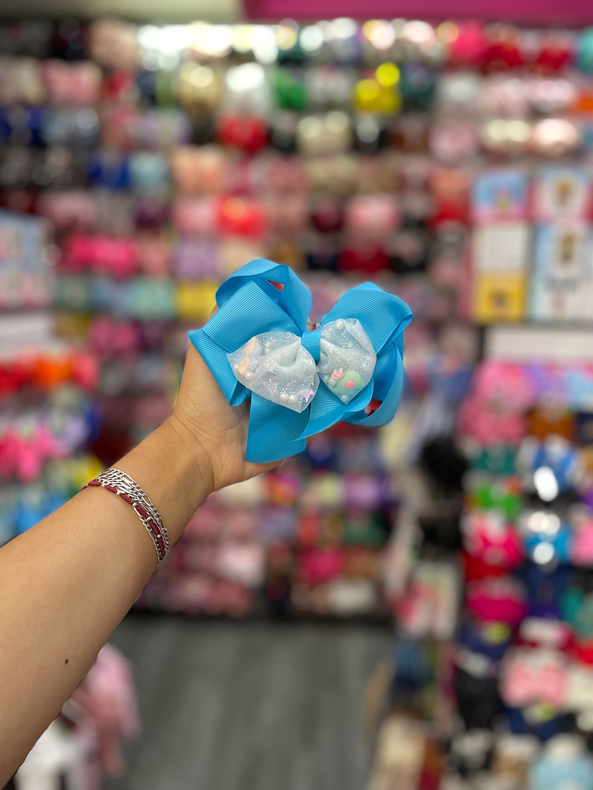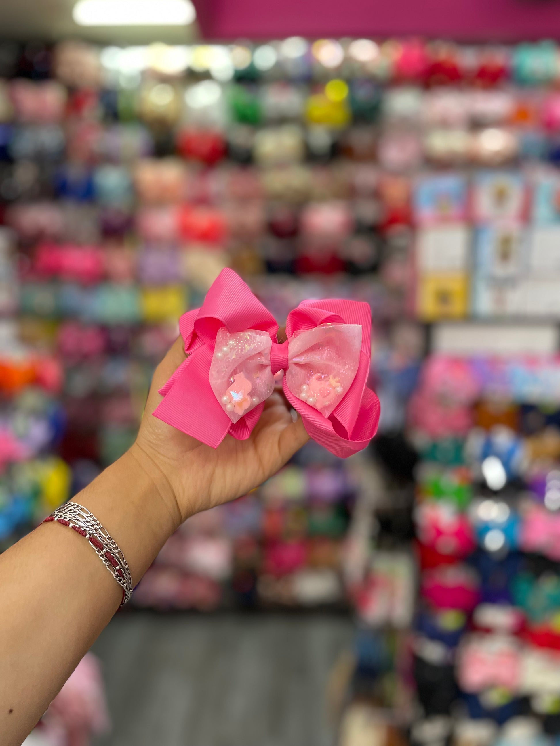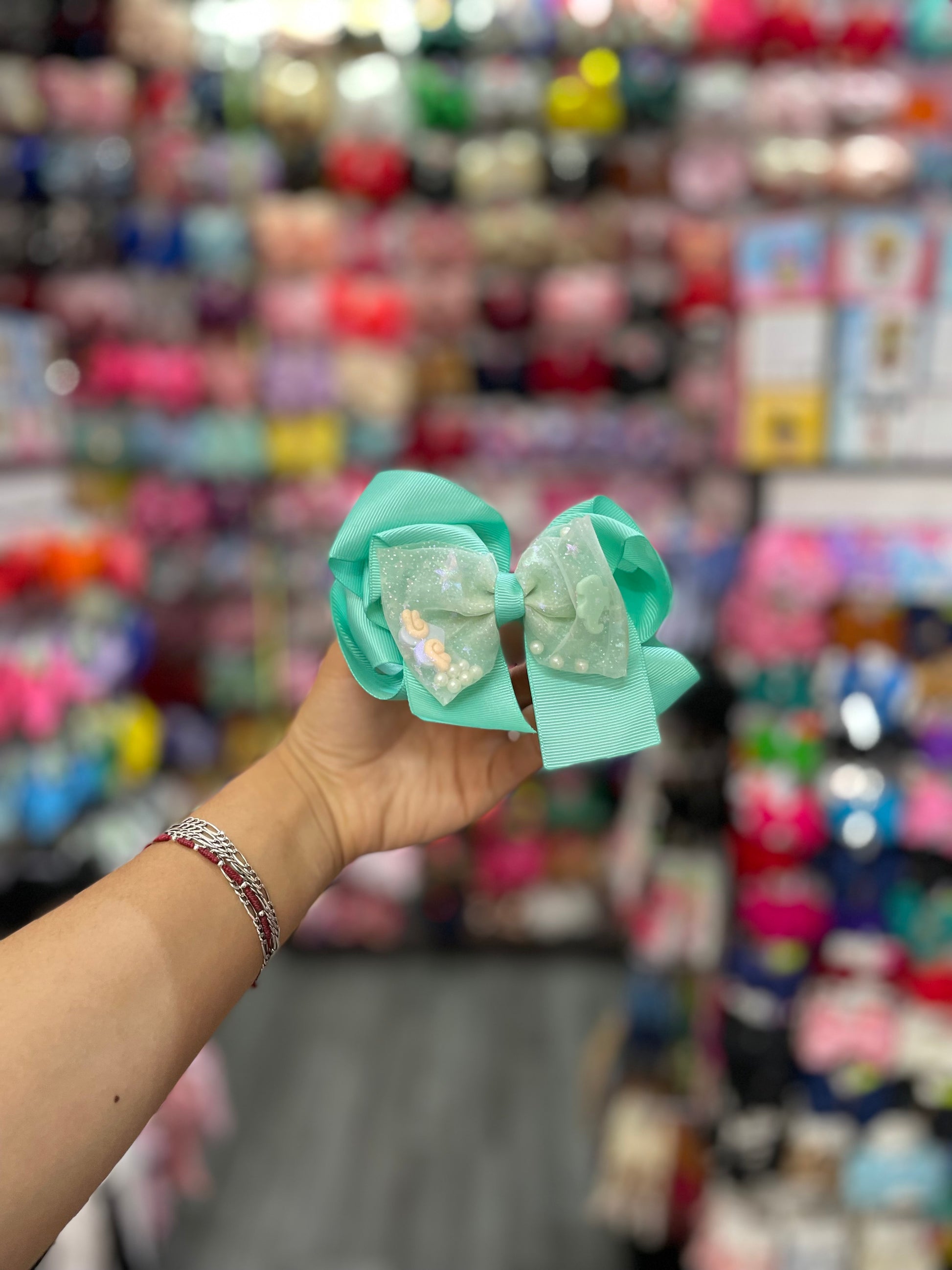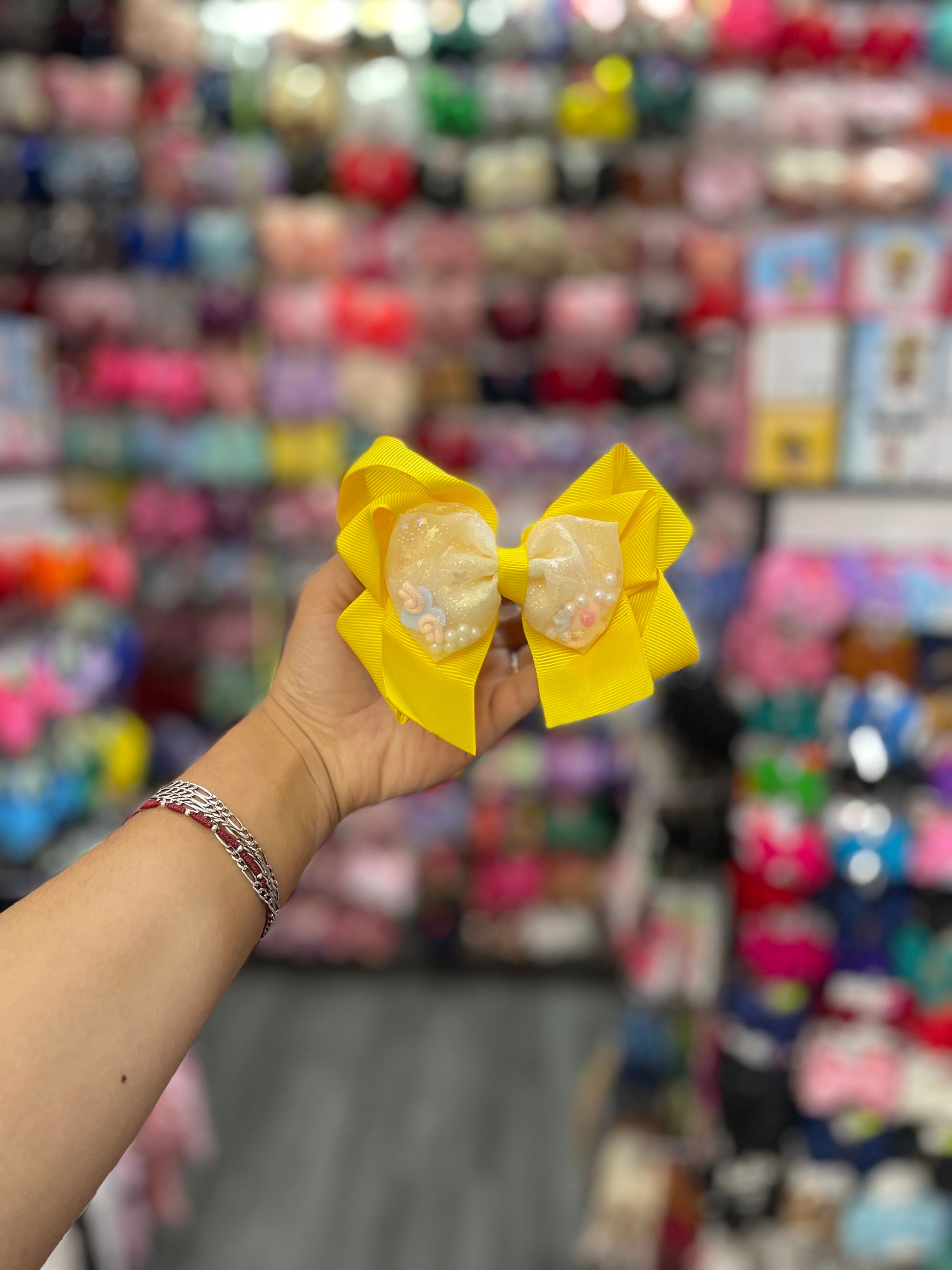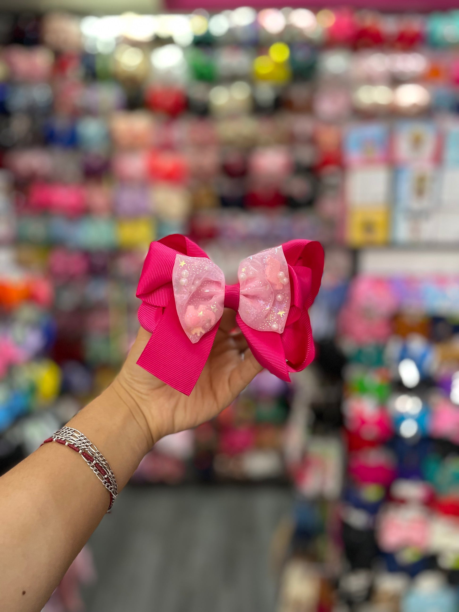 Este moño doble es un accesorio encantador y lleno de estilo, compuesto por dos capas de lazos que se combinan en un diseño armonioso. La primera capa, más grande, está hecha de una tela suave y elegante, como satén o grosgrain, en un tono sólido y vibrante que le da cuerpo y presencia. La segunda capa, más pequeña, está confeccionada con delicado tul, que aporta ligereza y volumen al conjunto. El moño de tul en el centro tiene una textura etérea y fluida, con pliegues suaves que se entrelazan, creando una sensación de movimiento. El contraste entre la opacidad del primer moño y la transparencia del tul en el centro añade profundidad y dinamismo al diseño. Este moño doble, con su elegante combinación de materiales, es perfecto para quienes buscan un accesorio femenino y sofisticado con un toque de suavidad y frescura.