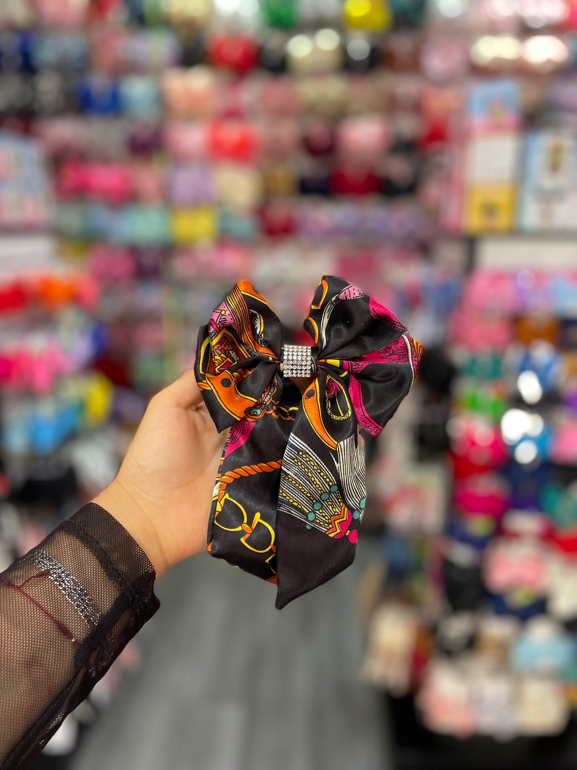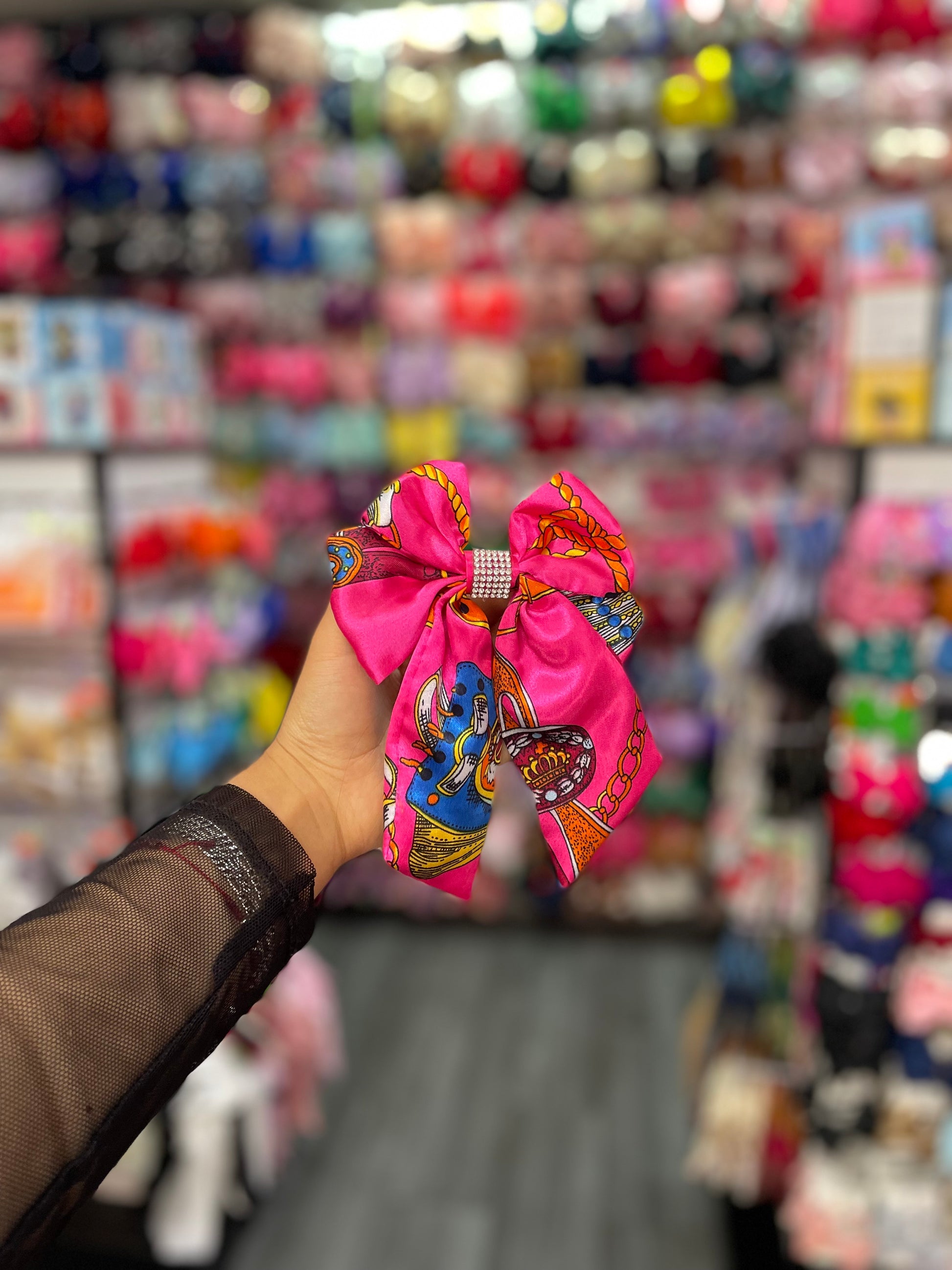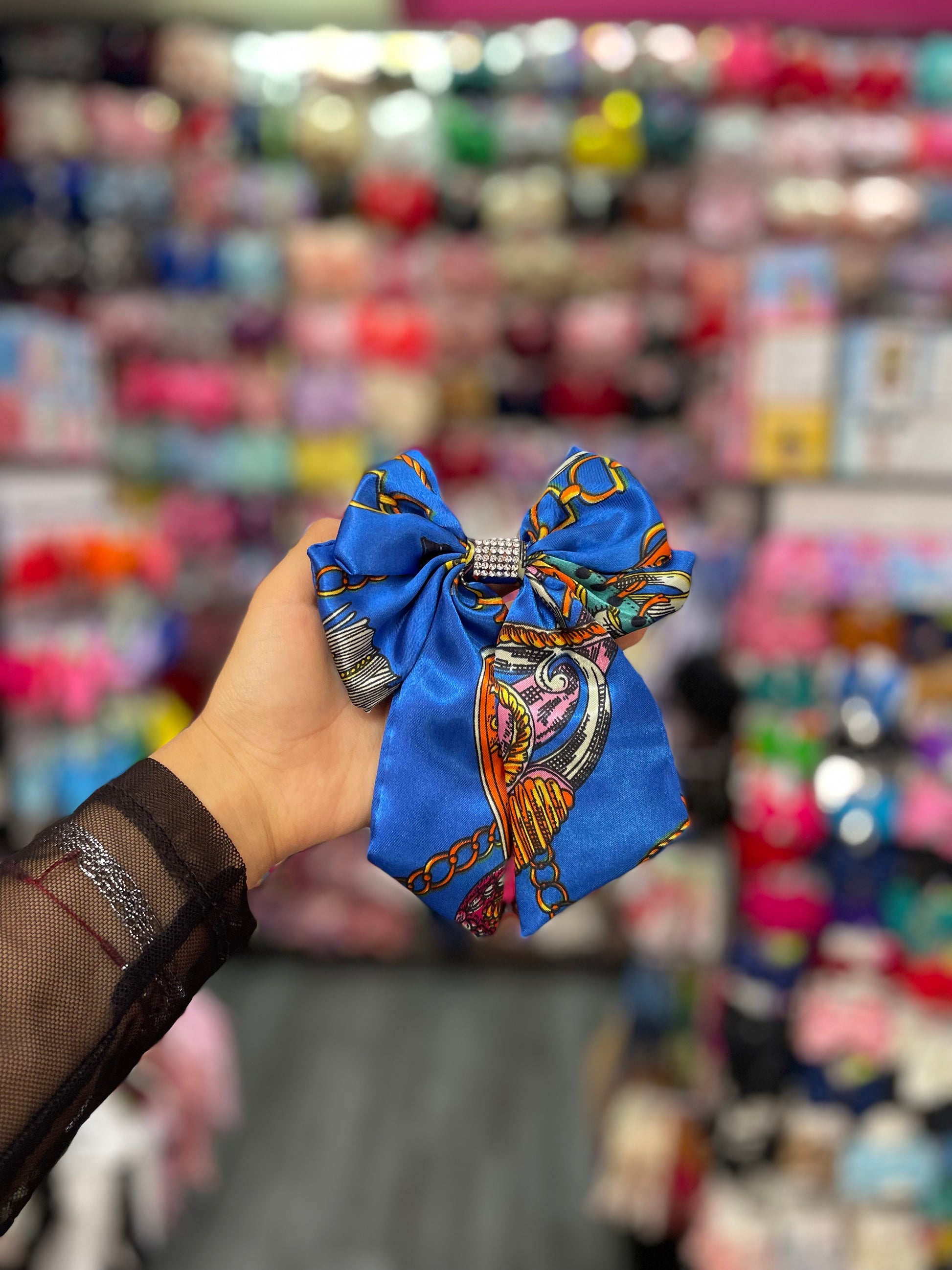 Este moño estampado con pedrería en el centro es una pieza que combina diversión y sofisticación de manera perfecta. El estampado vibrante, lleno de colores y patrones llamativos, le da un toque fresco y moderno, mientras que el detalle de pedrería en el centro añade un brillo elegante y lujoso. Las piedras, cuidadosamente dispuestas, capturan la luz y aportan un contraste deslumbrante con el estampado, elevando el diseño a un nivel de sofisticación. Ideal para ocasiones especiales o para darle un toque único y brillante a tu look diario, este moño es perfecto para quienes buscan una pieza que combine estilo y glamour.