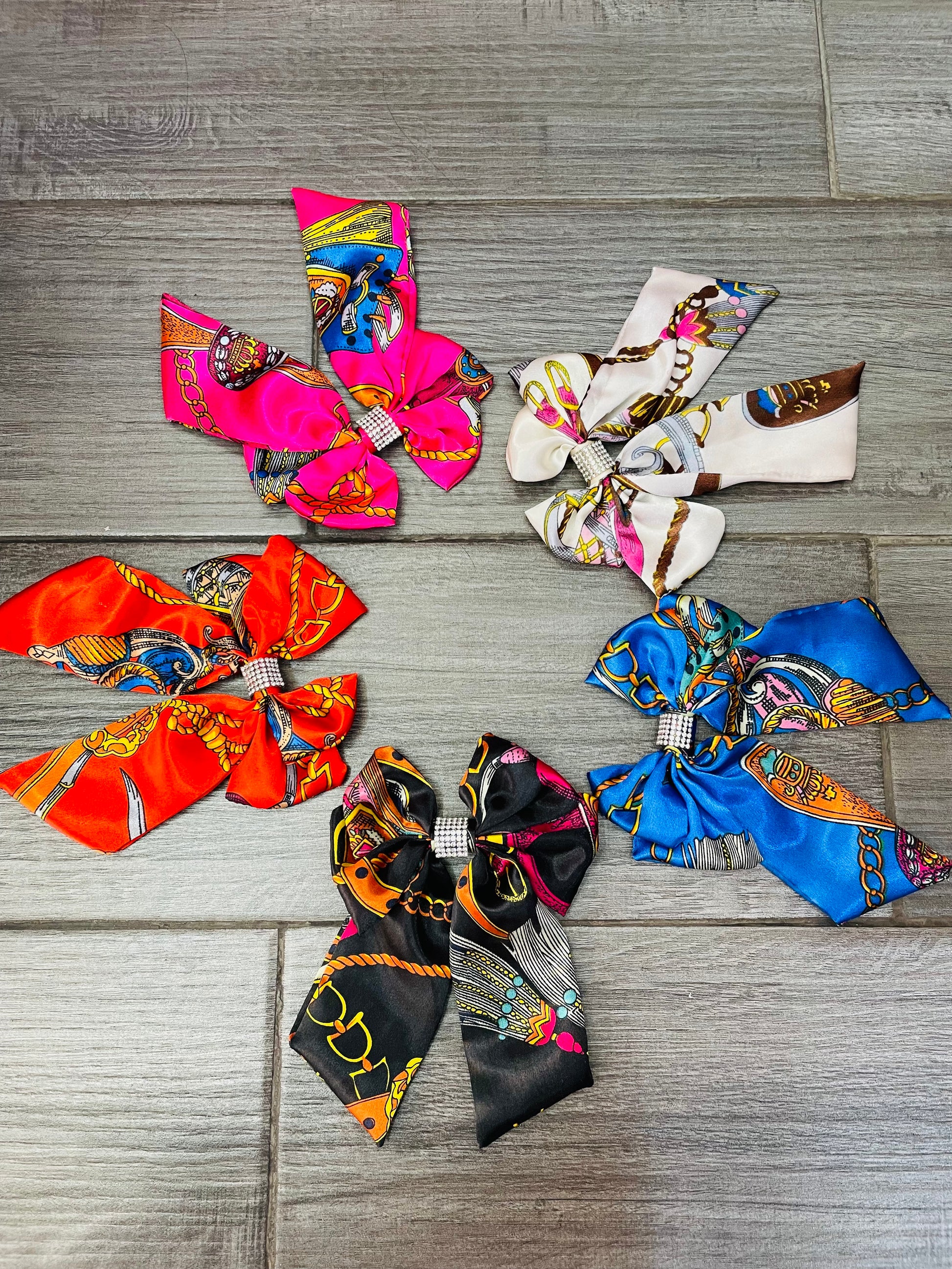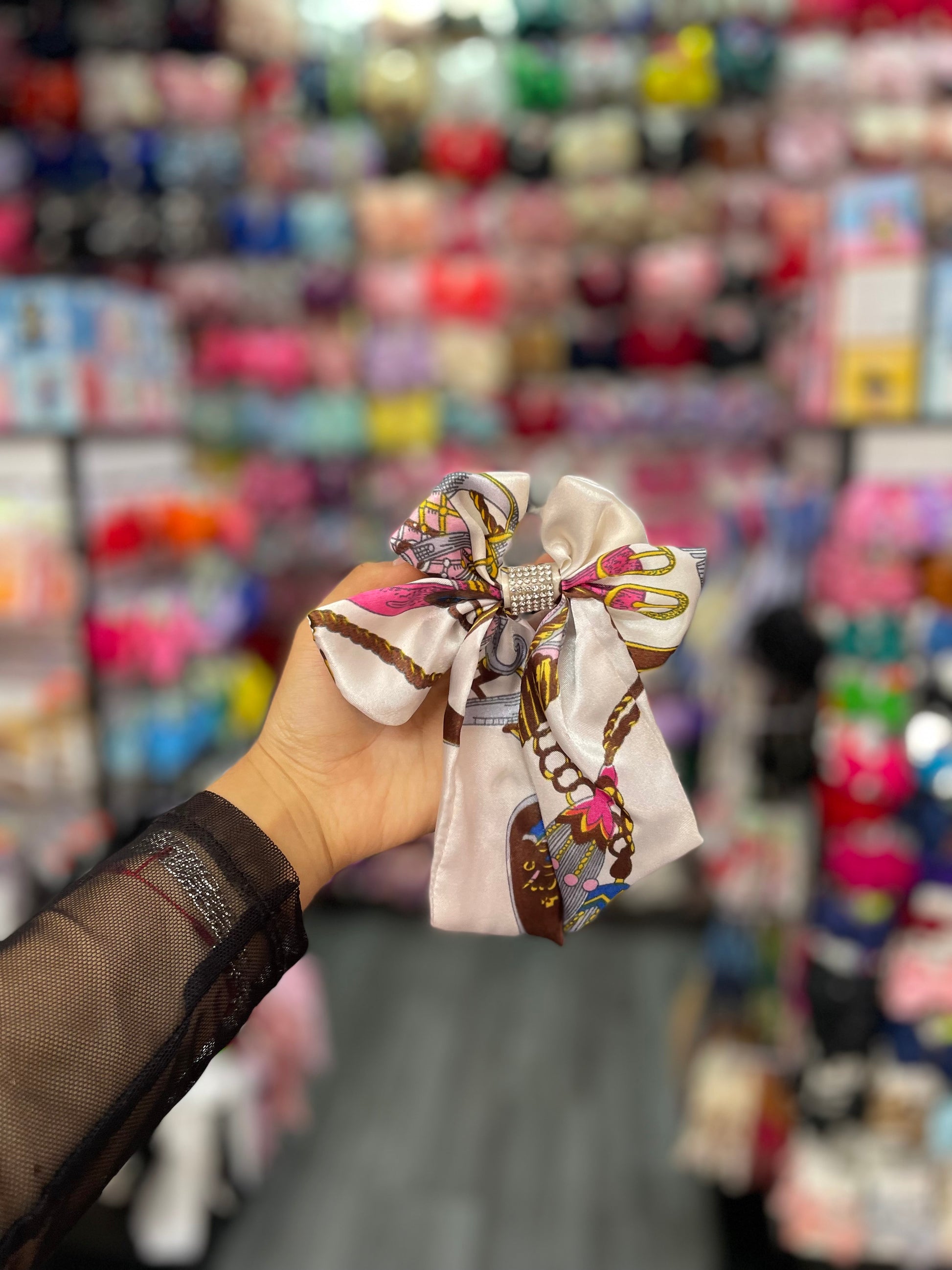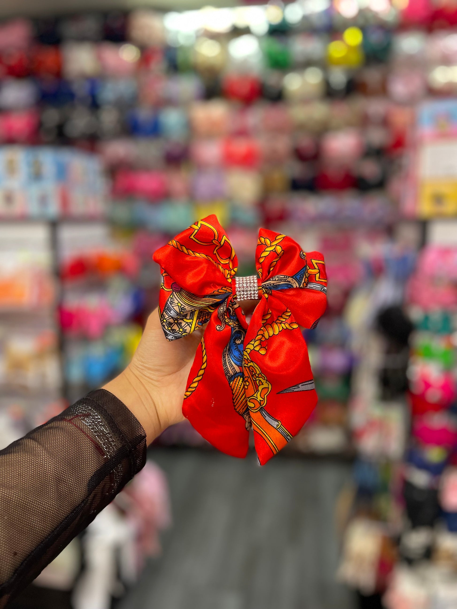 Este moño estampado con pedrería en el centro es una pieza que combina diversión y sofisticación de manera perfecta. El estampado vibrante, lleno de colores y patrones llamativos, le da un toque fresco y moderno, mientras que el detalle de pedrería en el centro añade un brillo elegante y lujoso. Las piedras, cuidadosamente dispuestas, capturan la luz y aportan un contraste deslumbrante con el estampado, elevando el diseño a un nivel de sofisticación. Ideal para ocasiones especiales o para darle un toque único y brillante a tu look diario, este moño es perfecto para quienes buscan una pieza que combine estilo y glamour.