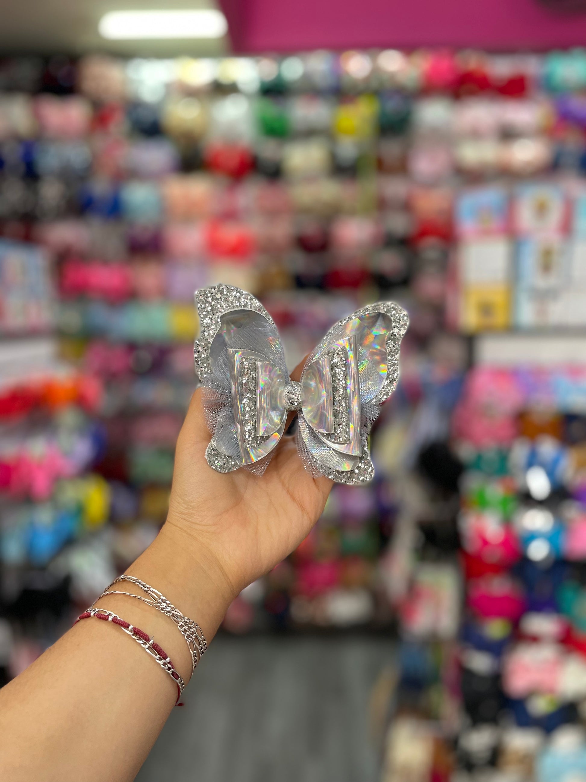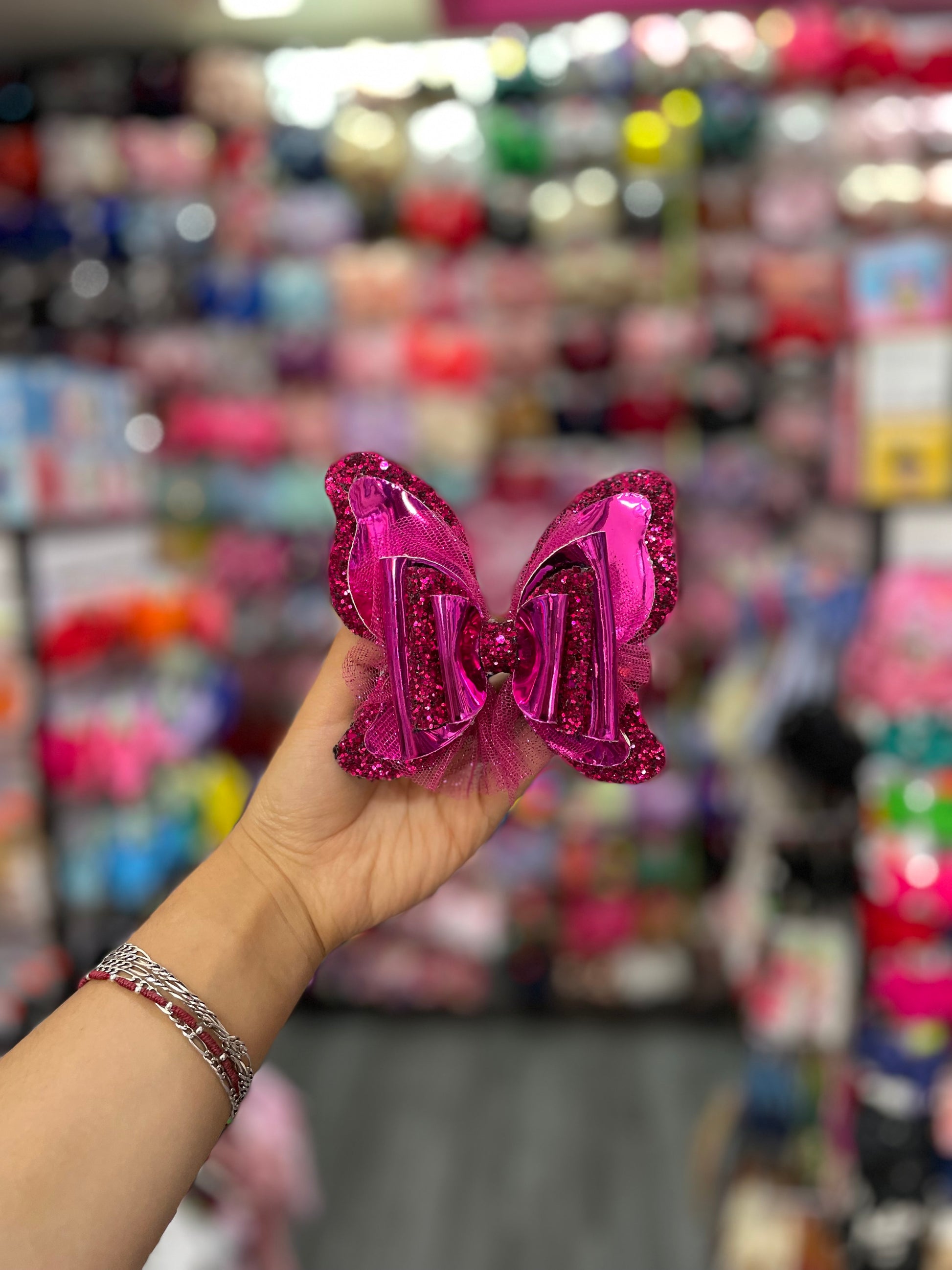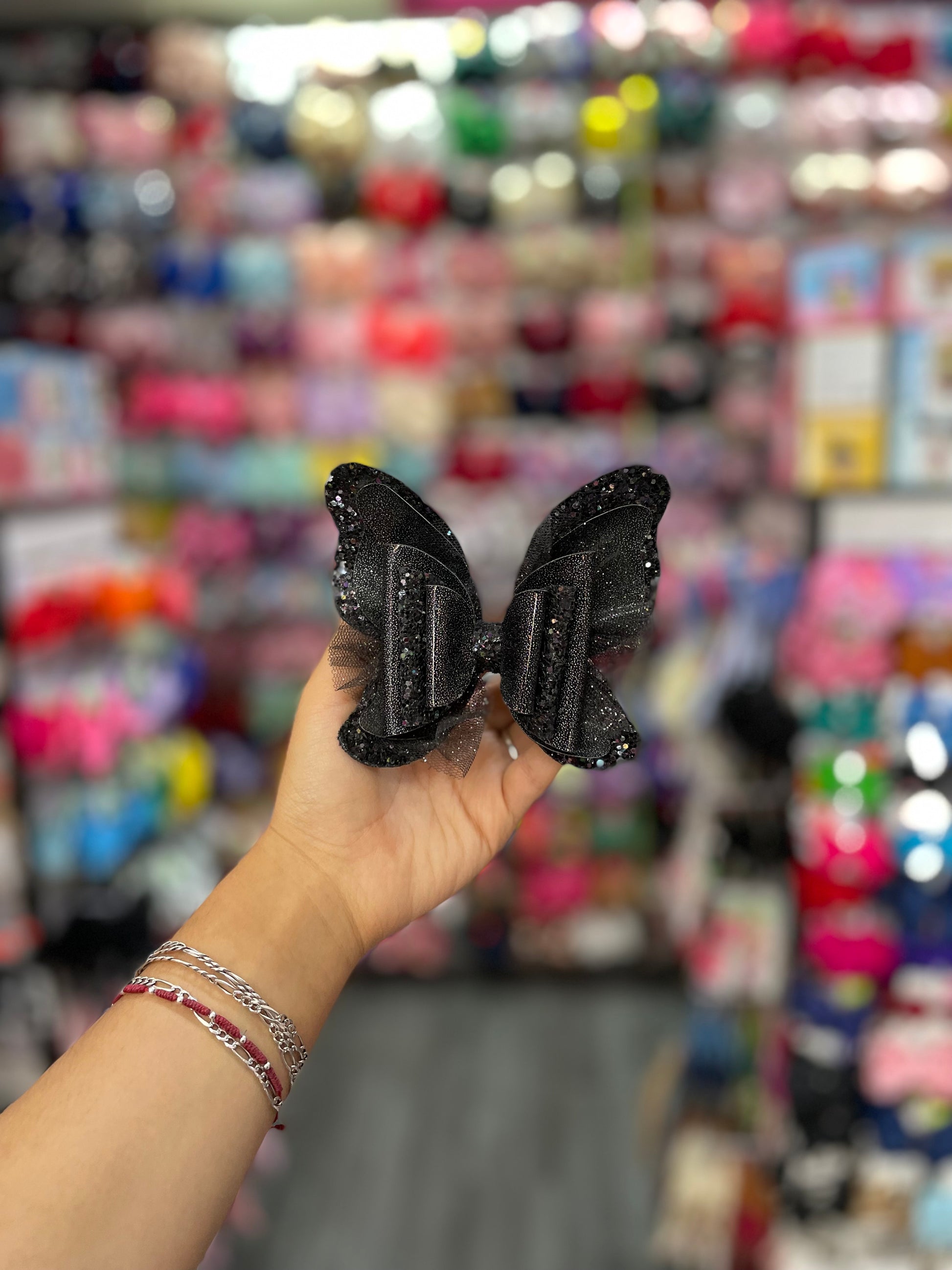 Este moño en forma de mariposa doble es un diseño espectacular que combina gracia y destellos de glamour. Confeccionado en dos capas, la primera capa tiene una estructura más grande y amplia, mientras que la segunda, que forma el cuerpo de la mariposa, es más pequeña y delicada. Ambas capas están elaboradas con una tela satinada que refleja la luz, dándole un brillo suave pero llamativo. Los bordes de cada ala de la mariposa están adornados con detalles brillantes, como pequeños cristales o lentejuelas, que capturan la luz y aportan un toque deslumbrante al conjunto. El efecto general recuerda a una mariposa en vuelo, con sus alas extendidas y su cuerpo bien definido en el centro del moño. Este moño es ideal para ocasiones especiales, aportando un aire de sofisticación y elegancia con un toque de magia y fantasía.