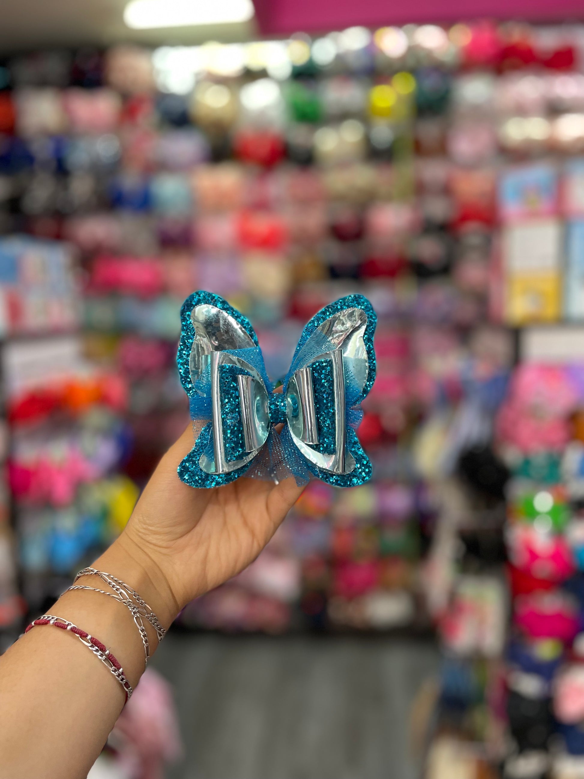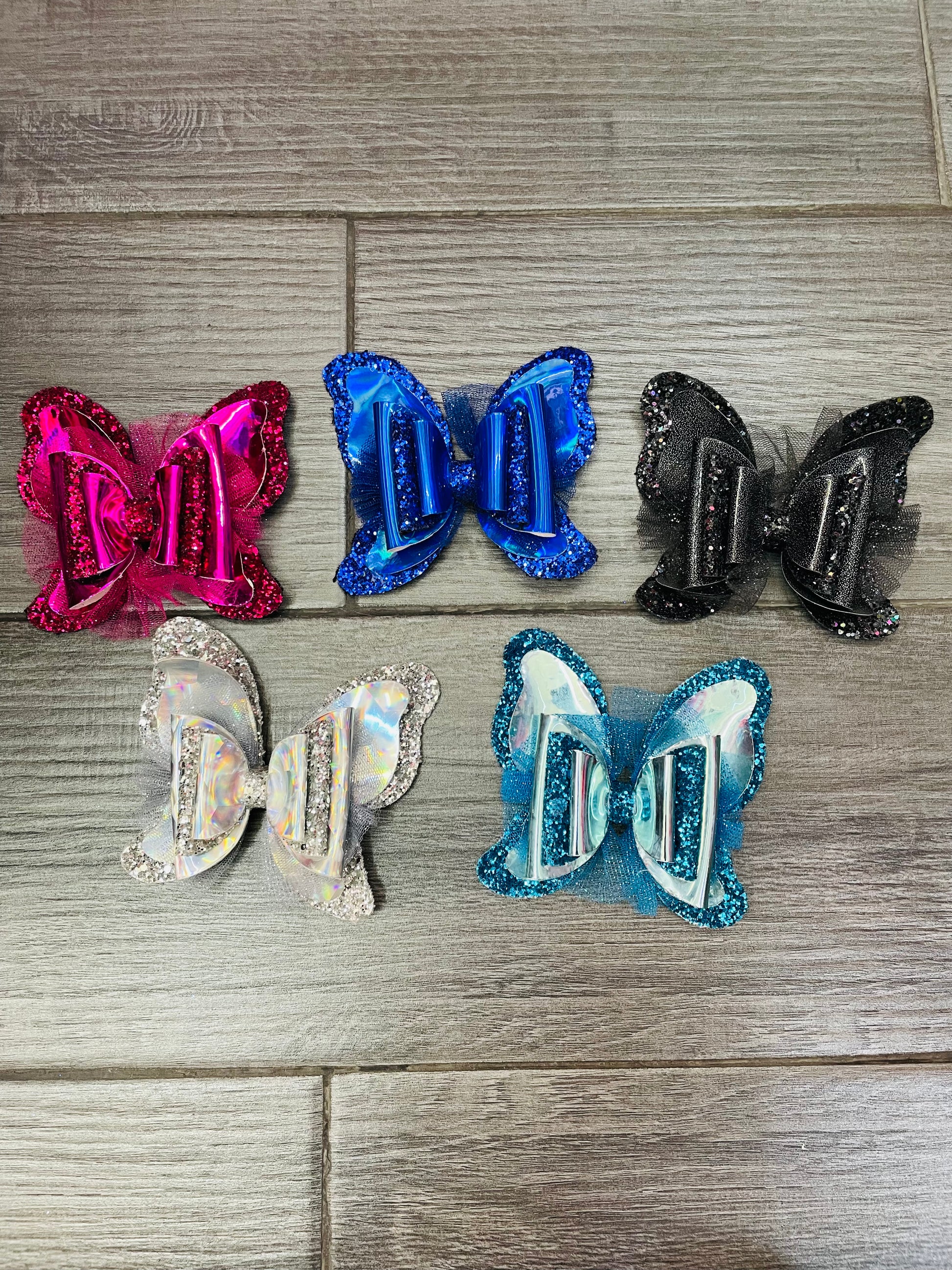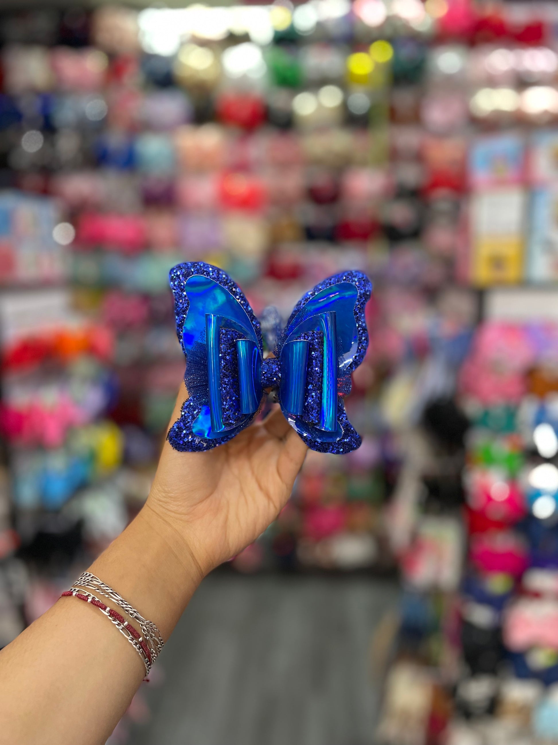 Este moño en forma de mariposa doble es un diseño espectacular que combina gracia y destellos de glamour. Confeccionado en dos capas, la primera capa tiene una estructura más grande y amplia, mientras que la segunda, que forma el cuerpo de la mariposa, es más pequeña y delicada. Ambas capas están elaboradas con una tela satinada que refleja la luz, dándole un brillo suave pero llamativo. Los bordes de cada ala de la mariposa están adornados con detalles brillantes, como pequeños cristales o lentejuelas, que capturan la luz y aportan un toque deslumbrante al conjunto. El efecto general recuerda a una mariposa en vuelo, con sus alas extendidas y su cuerpo bien definido en el centro del moño. Este moño es ideal para ocasiones especiales, aportando un aire de sofisticación y elegancia con un toque de magia y fantasía.