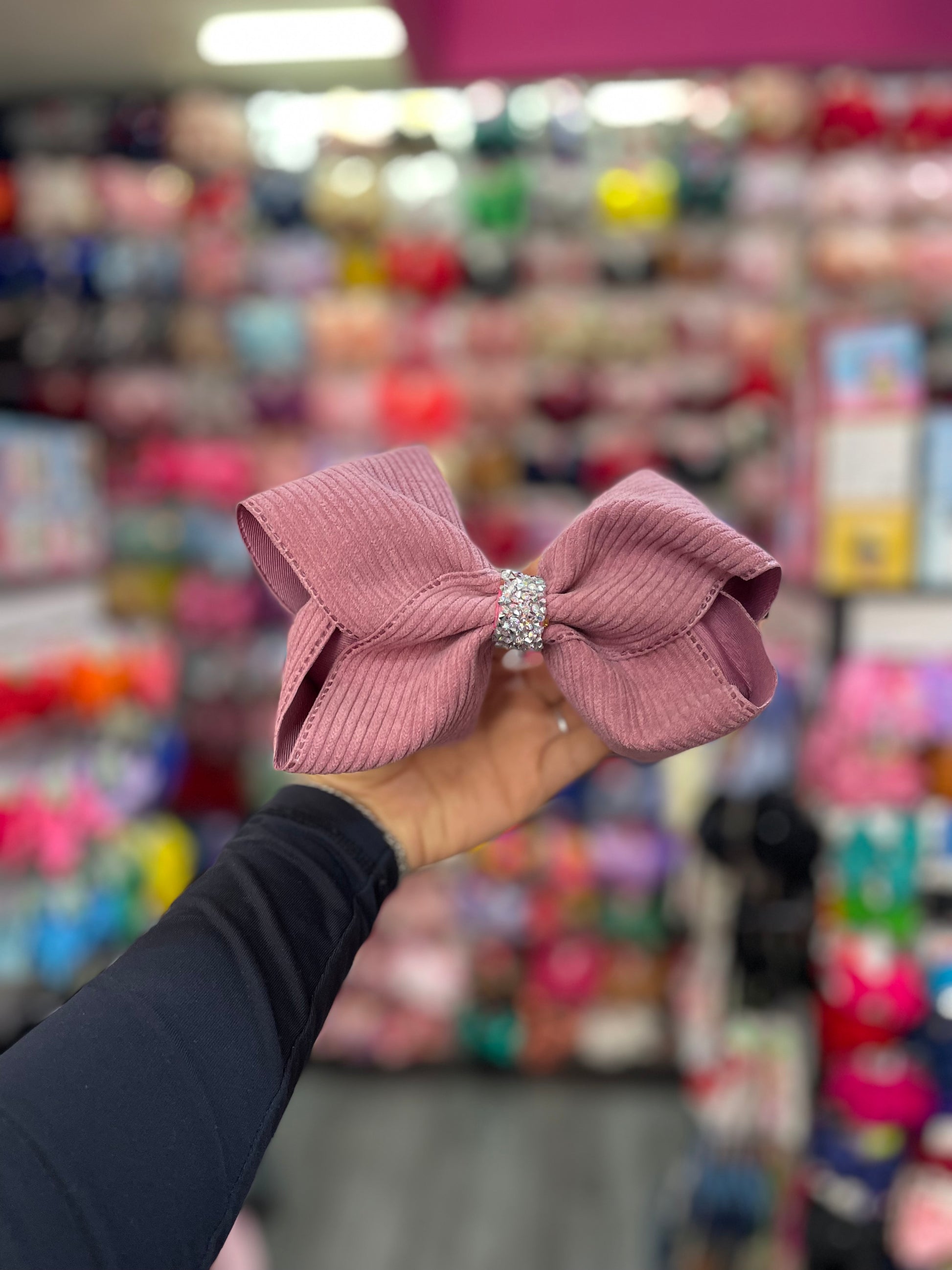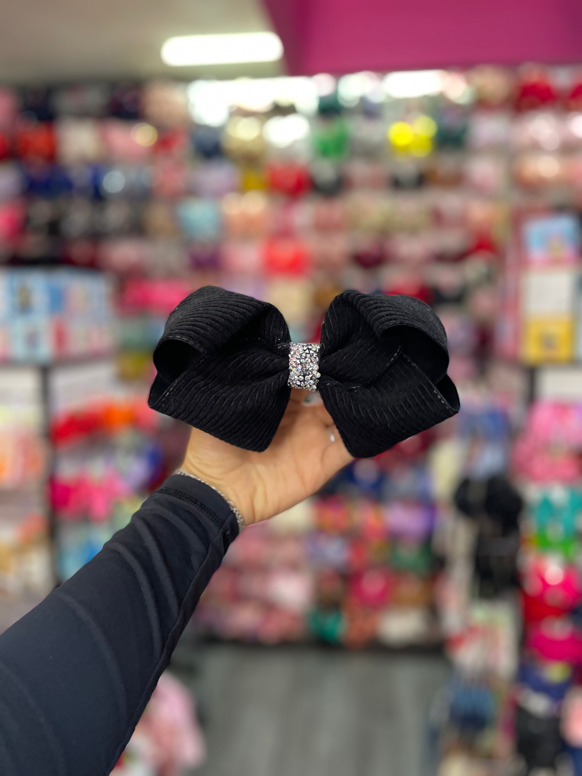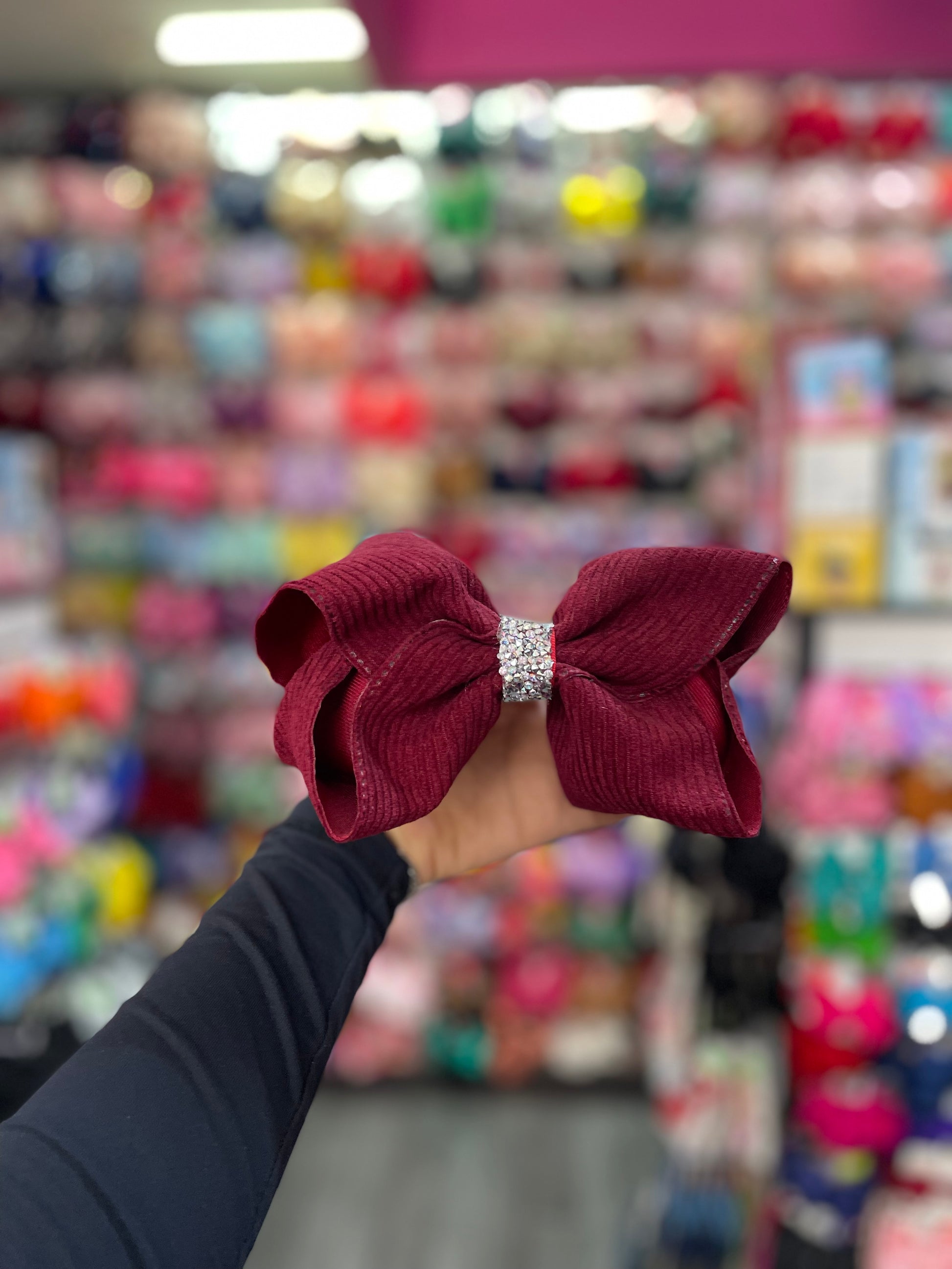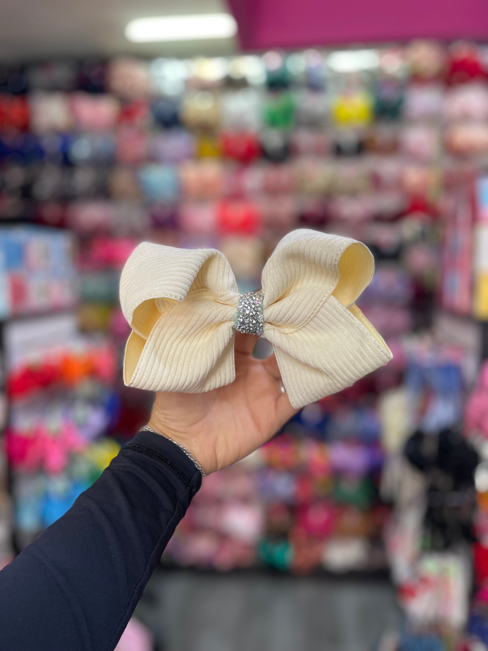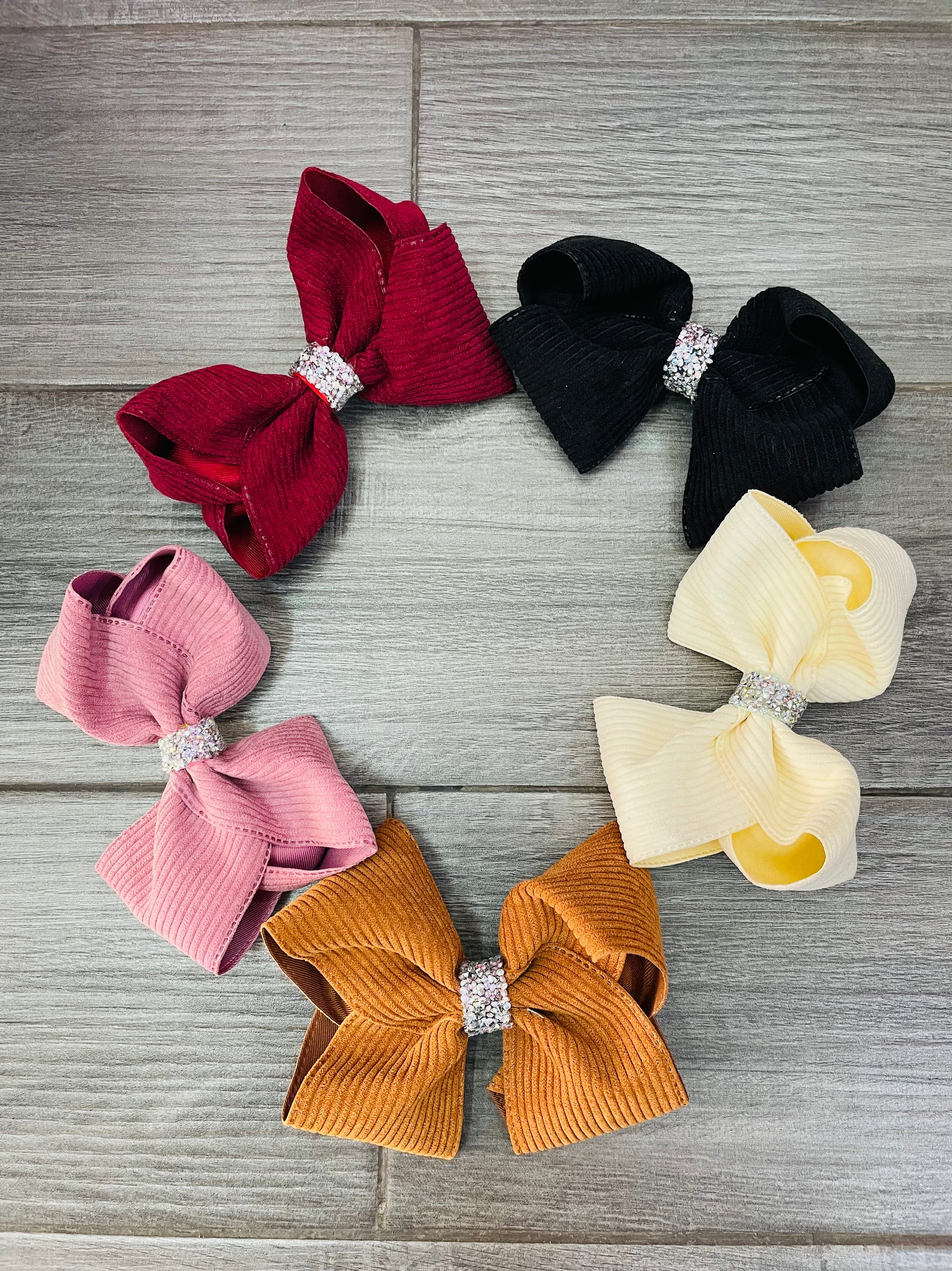 El moño de tela pana con brillo en el centro es un accesorio de cabello elegante y moderno. Está hecho de tela de pana, lo que le da una textura suave y ligeramente acanalada, ideal para un toque de sofisticación y comodidad. El moño presenta dos lazos grandes y bien formados, lo que le otorga un volumen equilibrado. En el centro, destaca un detalle brillante, como una pequeña piedra, una perla o una cinta con acabado metálico, que aporta un toque de luminosidad y distinción. Este tipo de moño es perfecto para ocasiones especiales, ya sea para un evento formal o para añadir un toque chic a un look diario, combinando la suavidad de la pana con un elegante destello de brillo.