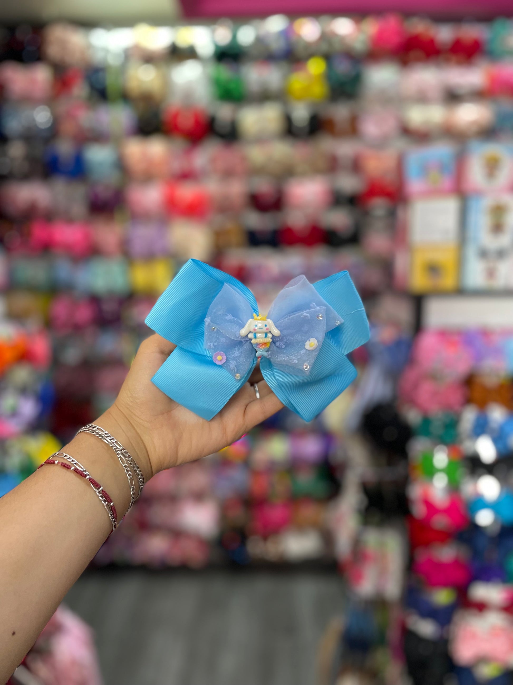El moño es encantador y juguetón, confeccionado con una tela suave y satinada en tonos pastel, principalmente rosa y blanco, que le otorgan un aire dulce y femenino. Los lazos son amplios y perfectamente formados, con bordes delicados que añaden un toque de sofisticación a su diseño. En el centro del moño, destaca una pieza tridimensional de Hello Kitty, con su inconfundible rostro, orejas de gato y lazos en su cabeza, todo cuidadosamente detallado con bordado y pequeños adornos brillantes. Este moño es perfecto para quienes buscan un accesorio divertido y adorable, con el toque entrañable de uno de los personajes más icónicos y queridos.