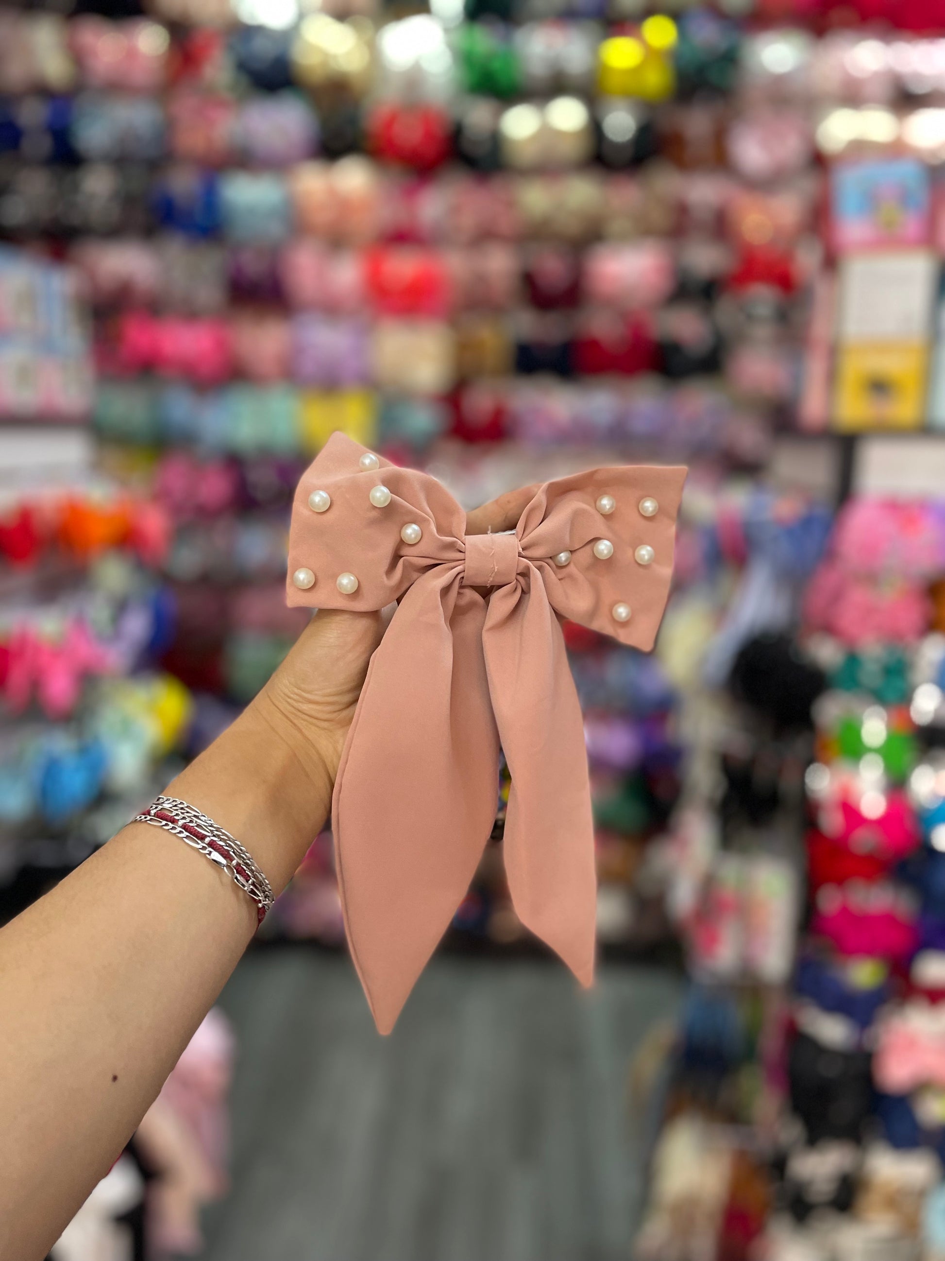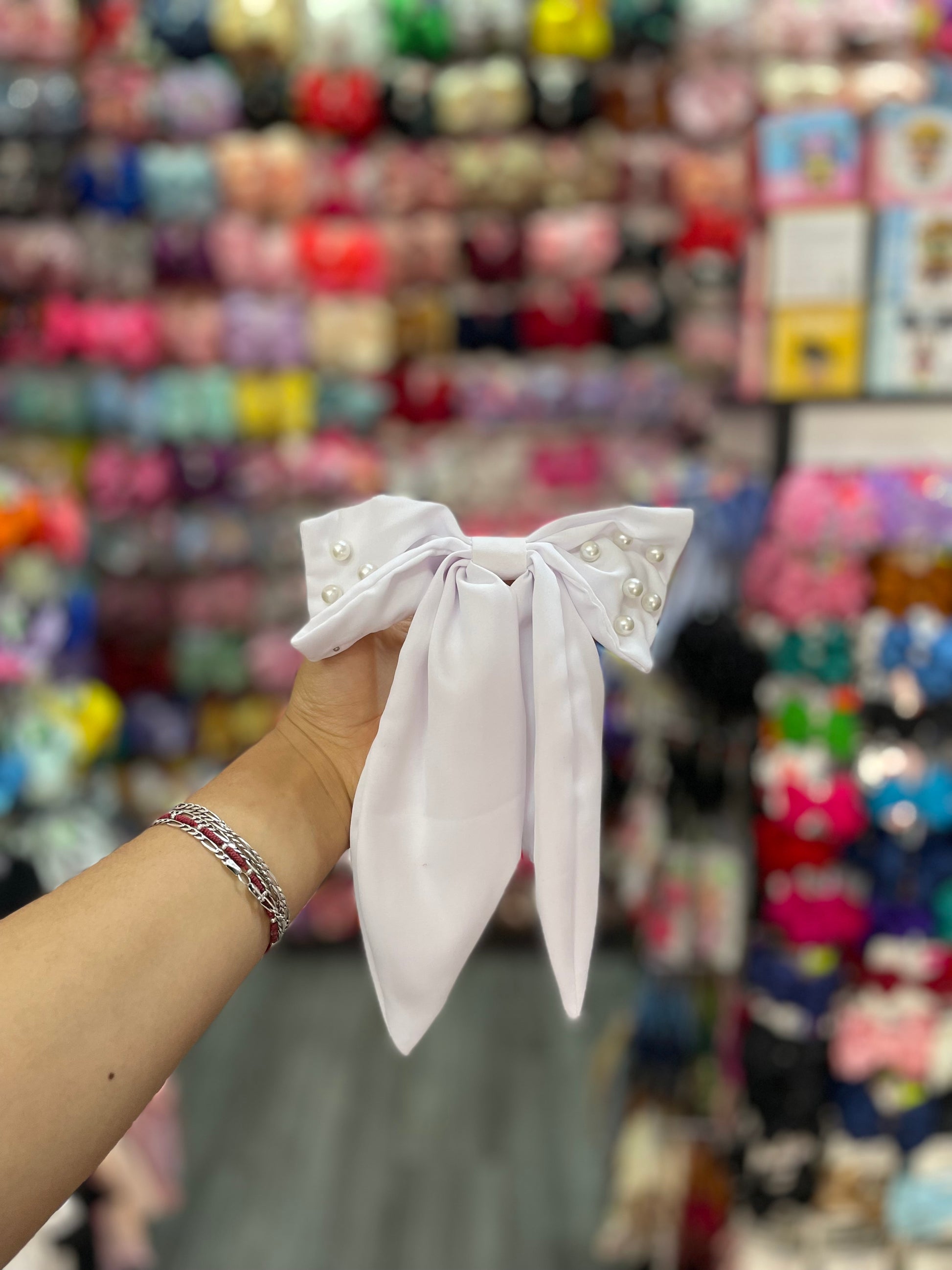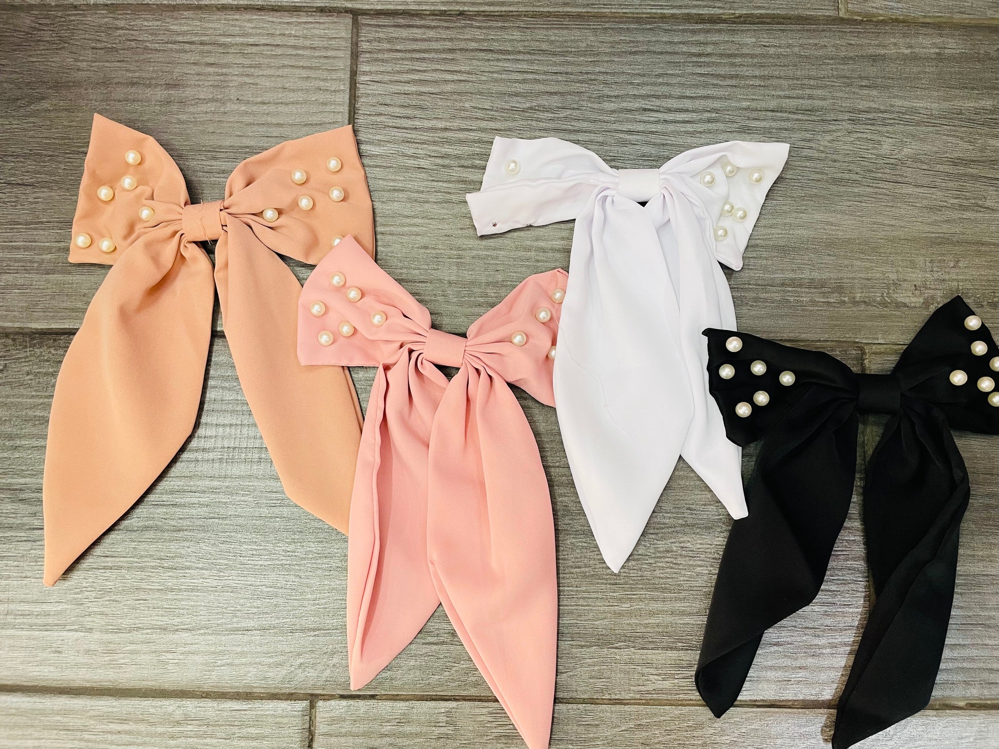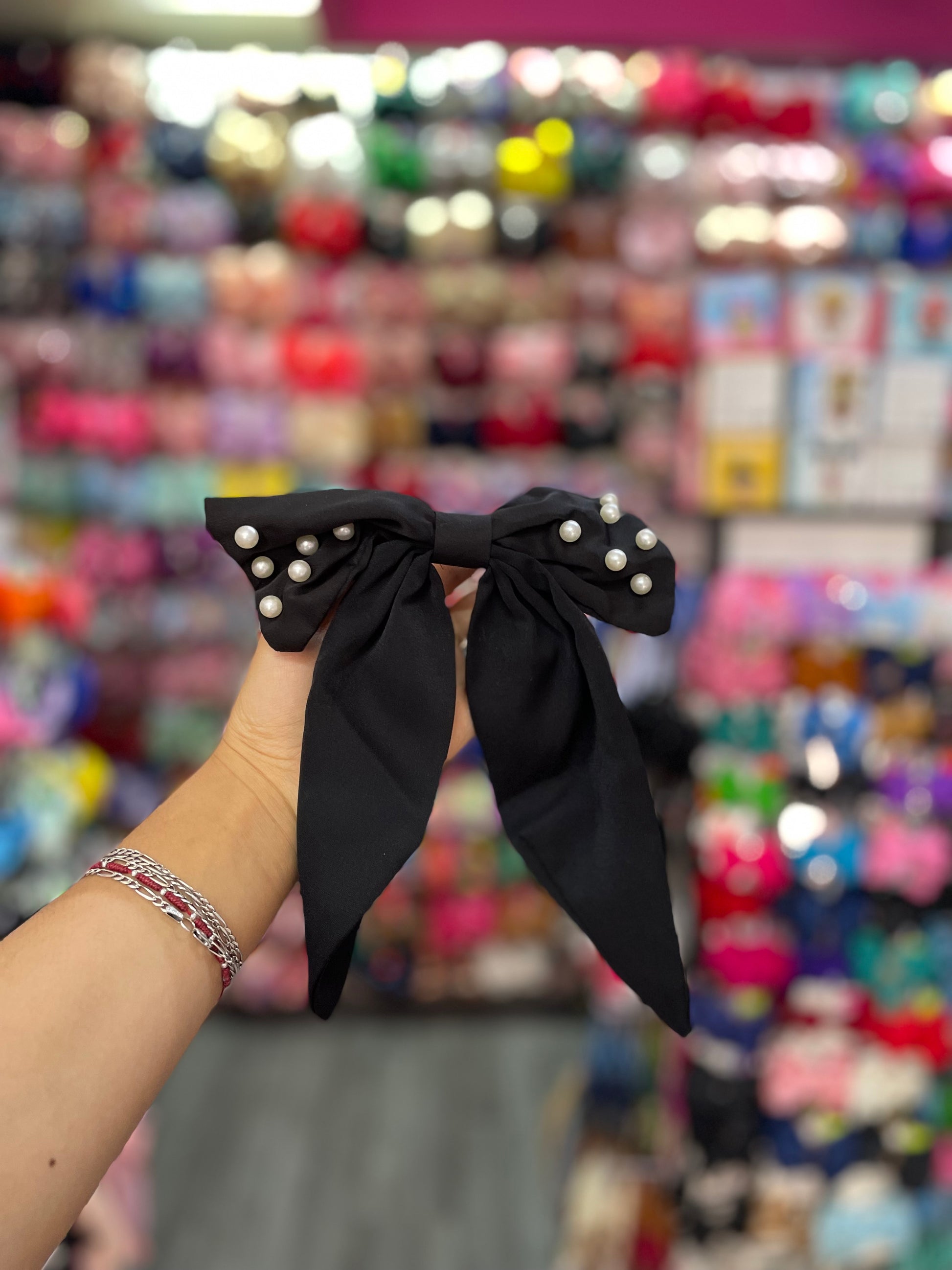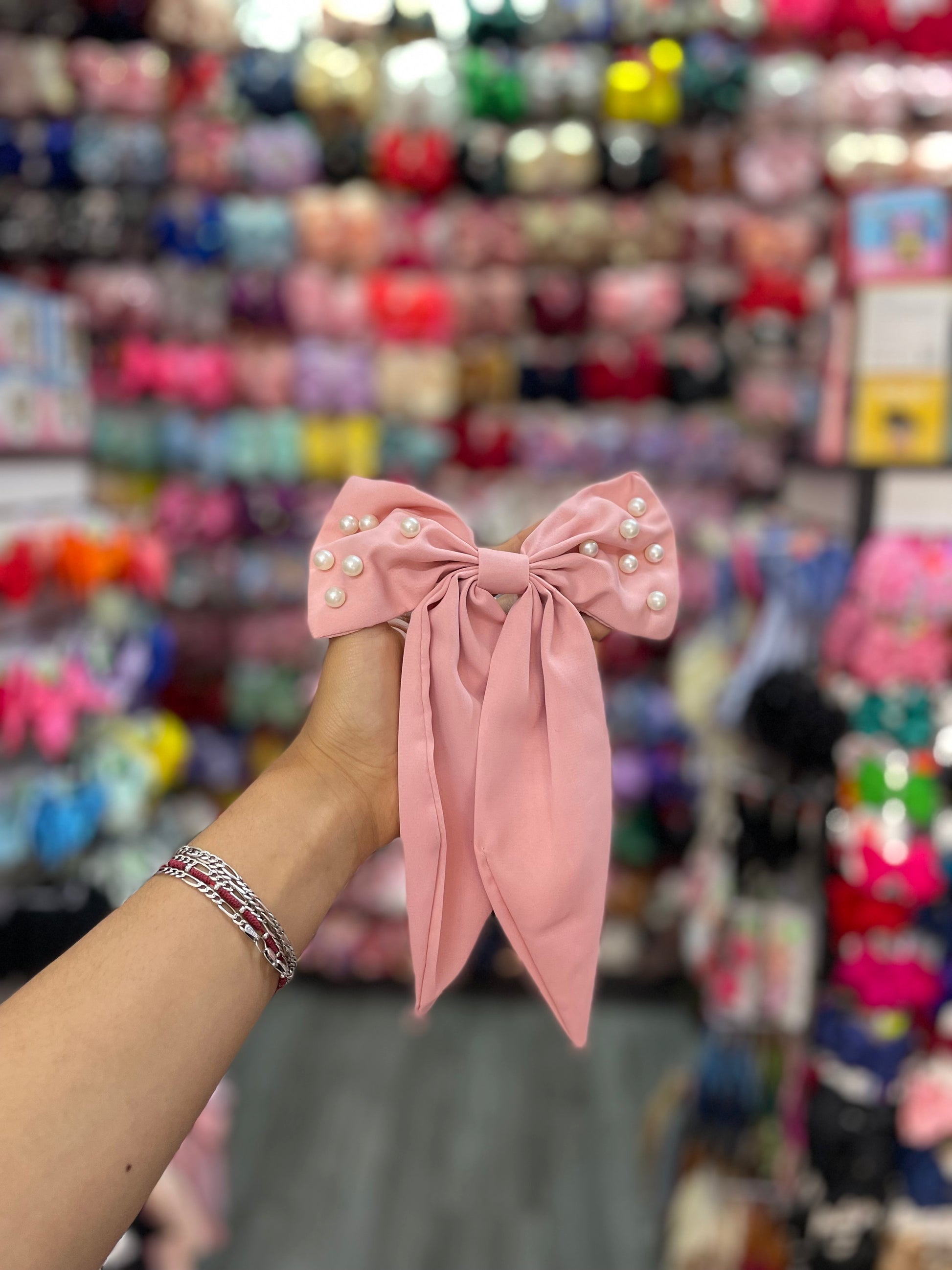 Un moño satinado con perlas es un accesorio de cabello sofisticado y elegante, diseñado para añadir un toque de lujo a cualquier peinado. Está confeccionado con tela de satén, que le proporciona un brillo suave y un acabado suave al tacto. El moño tiene una forma bien definida y pulida, lo que le otorga un estilo clásico y atemporal. A lo largo de sus lazos, se encuentran delicadas perlas que agregan un detalle de glamour sutil pero distintivo, aportando un toque de sofisticación y refinamiento. Este moño es perfecto para ocasiones formales, como bodas, galas o fiestas elegantes, y puede usarse tanto en el cabello recogido como en peinados semi-recogidos para un estilo impecable y de alta gama.